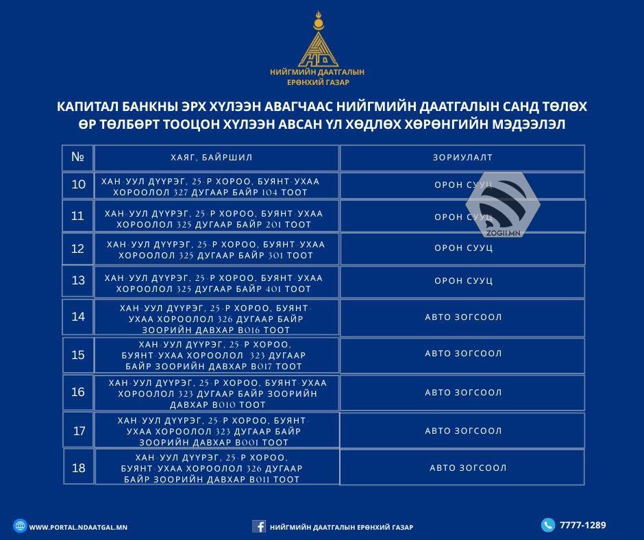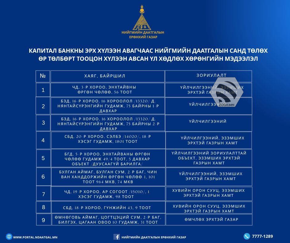 Чингэлтэй дүүргийн Иргэний хэргийн анхан шатны шүүхийн 2020 оны 10 дугаар сарын 27-ны өдрийн шүүхийн шийдвэрээр Капитал банкин дахь банкны эрх хүлээн авагчаас 104.2 тэрбум төгрөгийг гаргуулж Нийгмийн даатгалын ерөнхий газарт олгохоор шийдвэрлэсэн. Капитал банкны эрх хүлээн авагчаас нийгмийн даатгалын сангийн өр төлбөрт шүүхийн шийдвэр гарснаас хойш өнөөдрийг хүртэл нийт 13.8 тэрбум төгрөгийг мөнгөн хөрөнгөөр, 26.2 тэрбум төгрөгийн 87 ширхэг үл хөдлөх хөрөнгө хүлээн авсан бөгөөд 12.0 тэрбум төгрөгийн 62 хөрөнгийг худалдан борлуулаад байна. 2025 онд Нийгмийн даатгалын үндэсний зөвлөлийн шийдвэрээр 1.2 тэрбум төгрөгийн үнэ бүхий 9 ширхэг үл хөдлөх хөрөнгийг өр төлбөрт тооцон, мөнгөн хөрөнгөөр 0.3 тэрбум төгрөг шилжүүлснээр нийт 1.5 тэрбум төгрөгийн өр төлбөр барагдаж Капитал банкны нийгмийн даатгалын санд төлөх өр төлбөрөөс 40.2 тэрбум төгрөгийн өр барагдаж, 64.2 тэрбум төгрөгийн үлдэгдэлтэй байна. Хоёр банкны өрийг барагдуулах ажлыг эрчимжүүлэхээр Монгол Улсын Ерөнхий сайдын 2025 оны 75 дугаар захирамжаар ажлын хэсэг байгуулагдаж, тус ажлын хэсгийн хүрээнд Ерөнхий сайдын захирамжаар байгуулагдсан ажлын хэсгийн хүрээнд Капитал банк болон Чингис хаан банк ХХК-иас нийт 149.2 тэрбум төгрөгийн өр төлбөрийн үлдэгдлийг барагдуулах чиглэлээр холбогдох эрх бүхий байгууллагуудтай хамтран ажиллаж байна. Капитал банкны нийгмийн даатгалын санд төлөгдөх өр төлбөрт тооцон авсан 18 байршилд байгаа 25 ширхэг үл хөдлөх хөрөнгийн жагсаалтыг та бүхэнд ил тод, нээлттэйгээр танилцуулж байна.