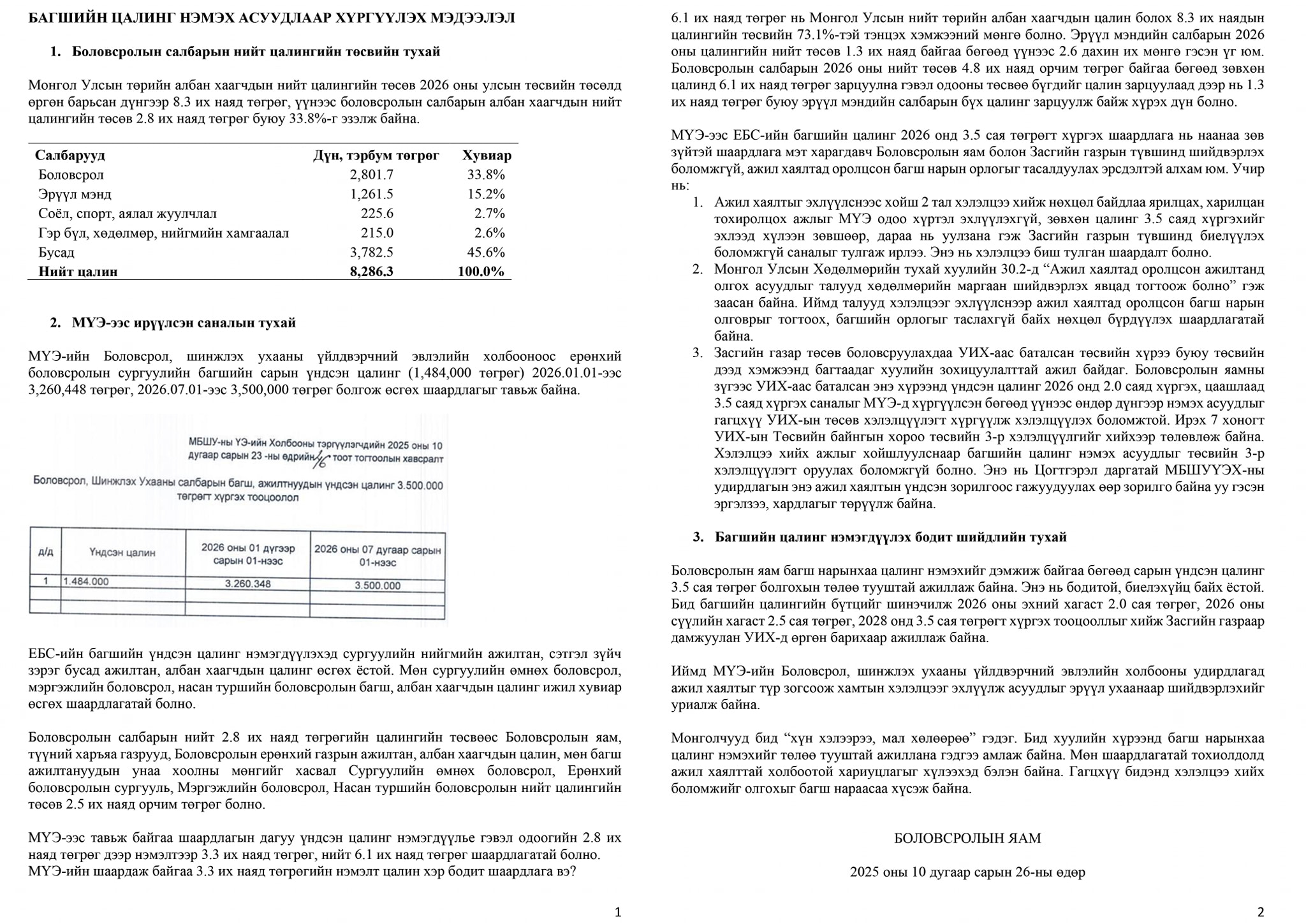 Монгол Улсын нийт төрийн албан хаагчдын цалин 2026 оны Улсын төсөвт өргөн барьсан дүнгээр 8.3 их наяд төгрөг, үүнээс боловсролын салбарын албан хаагчдын нийт цалин 2.8 их наяд буюу 33.8 хувийг эзэлж байгаа талаар Боловсролын яам мэдээлэв.