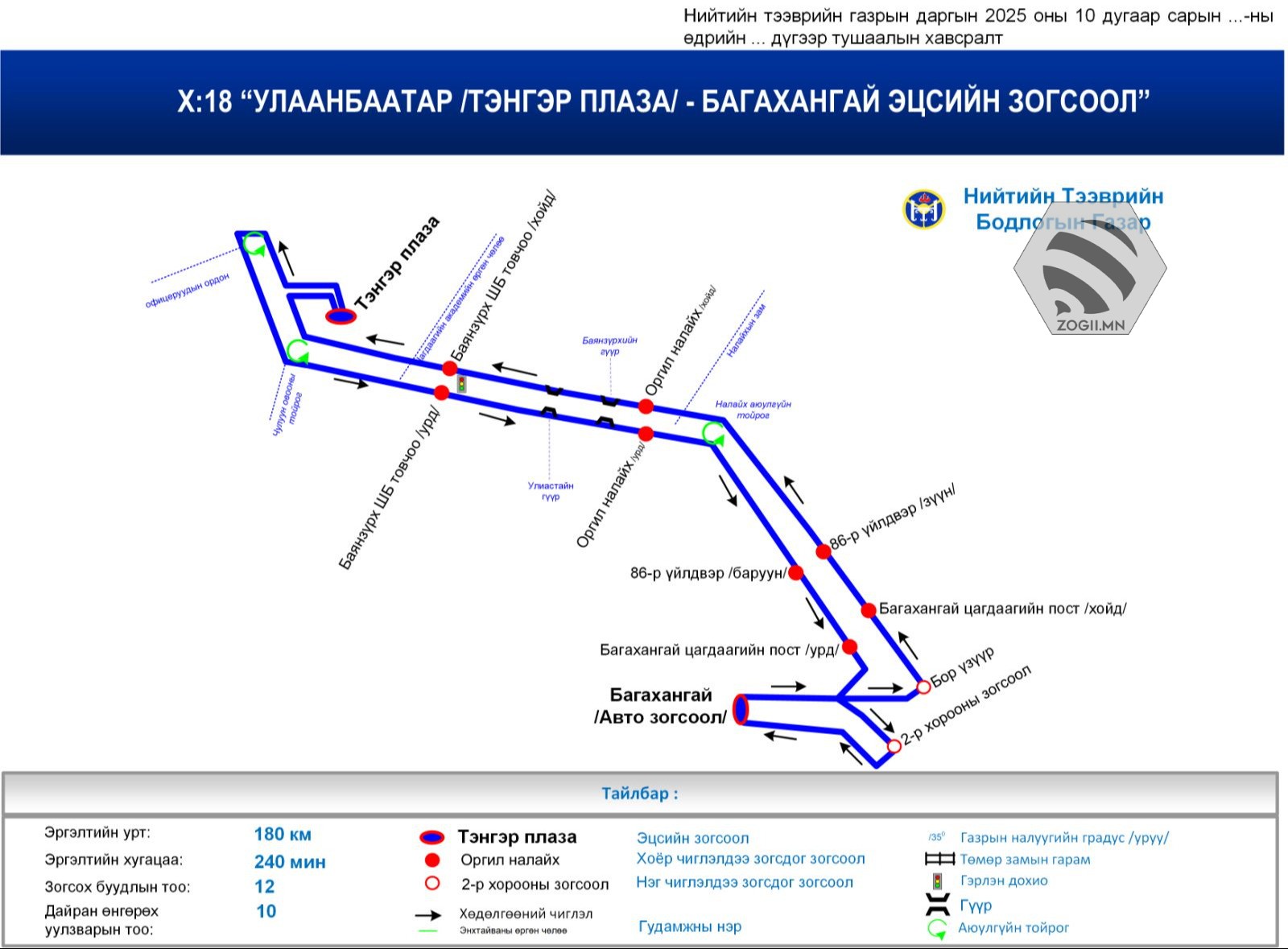 Багахангай дүүргийн 1, 2 дугаар хорооны иргэдийн нийтийн тээврийн хэрэгслээр зорчих эрэлтийг хангах, хүртээмжийг нэмэгдүүлэх зорилгоор Х:18 “Улаанбаатар Тэнгэр плаза-Багахангай цагдаагийн пост хойд, Бор үзүүр дундын зогсоолуудыг нэмж өөрчлөлт оруулав.