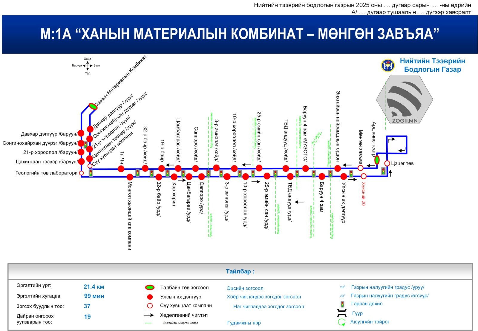 Сонгинохайрхан дүүргийн 5, 19, 27 дугаар хорооны иргэдийн нийтийн тээврийн хүртээмжийг нэмэгдүүлэх зорилгоор М:1А “5 шар-Мөнгөн завьяа” чиглэлийн замналд өөрчлөлт оруулж М:1А “Ханын материалын комбинат-Мөнгөн завьяа” чиглэл болгон шинэчлэв.