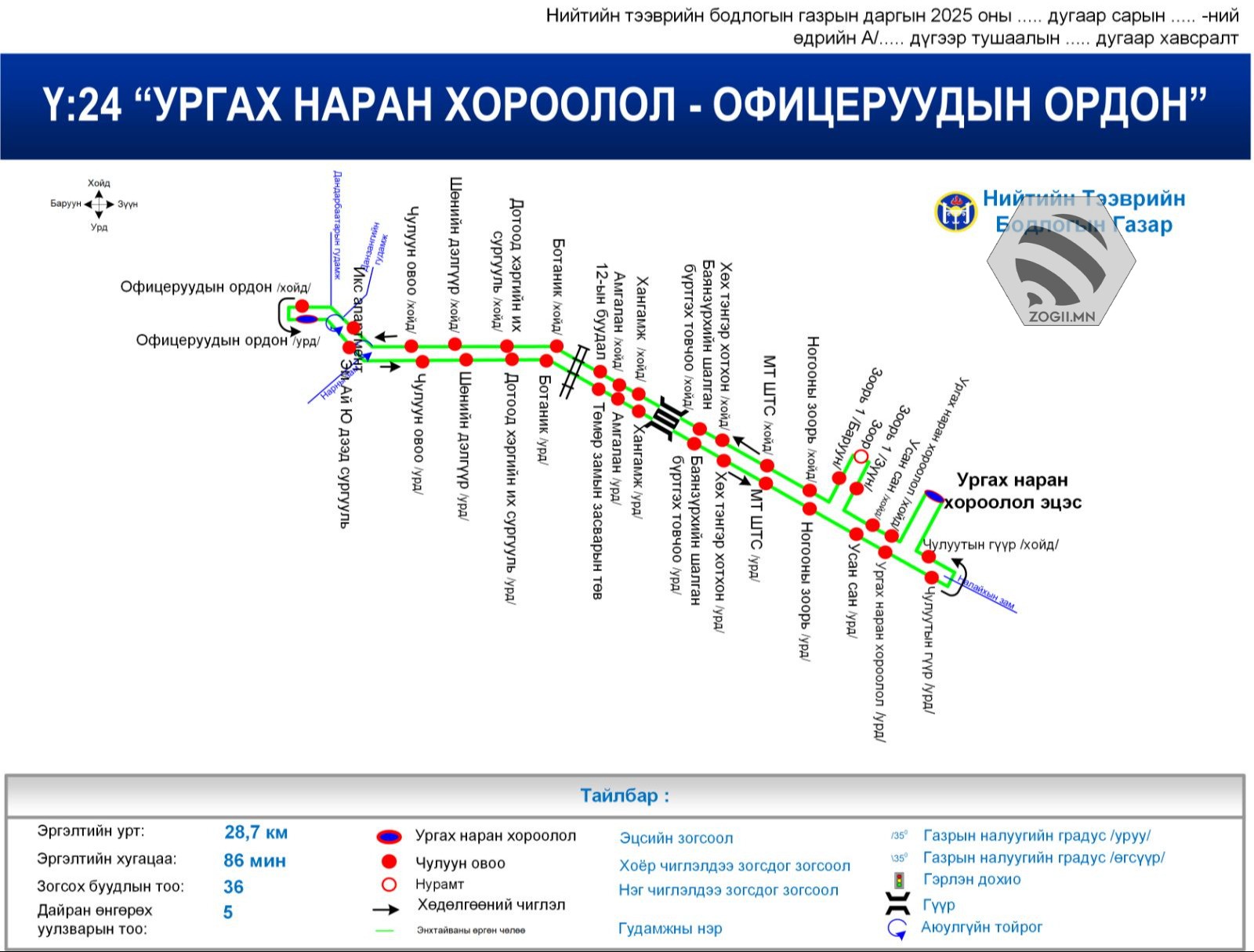 Түүнчлэн Баянзүрх дүүргийн 11 дүгээр хорооны иргэдийн нийтийн тээврийн хэрэгслээр зорчих эрэлтийг хангах, хүртээмжийг нэмэгдүүлэх зорилгоор Y:24 “Ургах наран хороолол-Офицеруудын ордон” чиглэлийн замналд Зоорь-1, Зоорь зогсоолуудыг нэмж, өөрчлөлт оруулав.