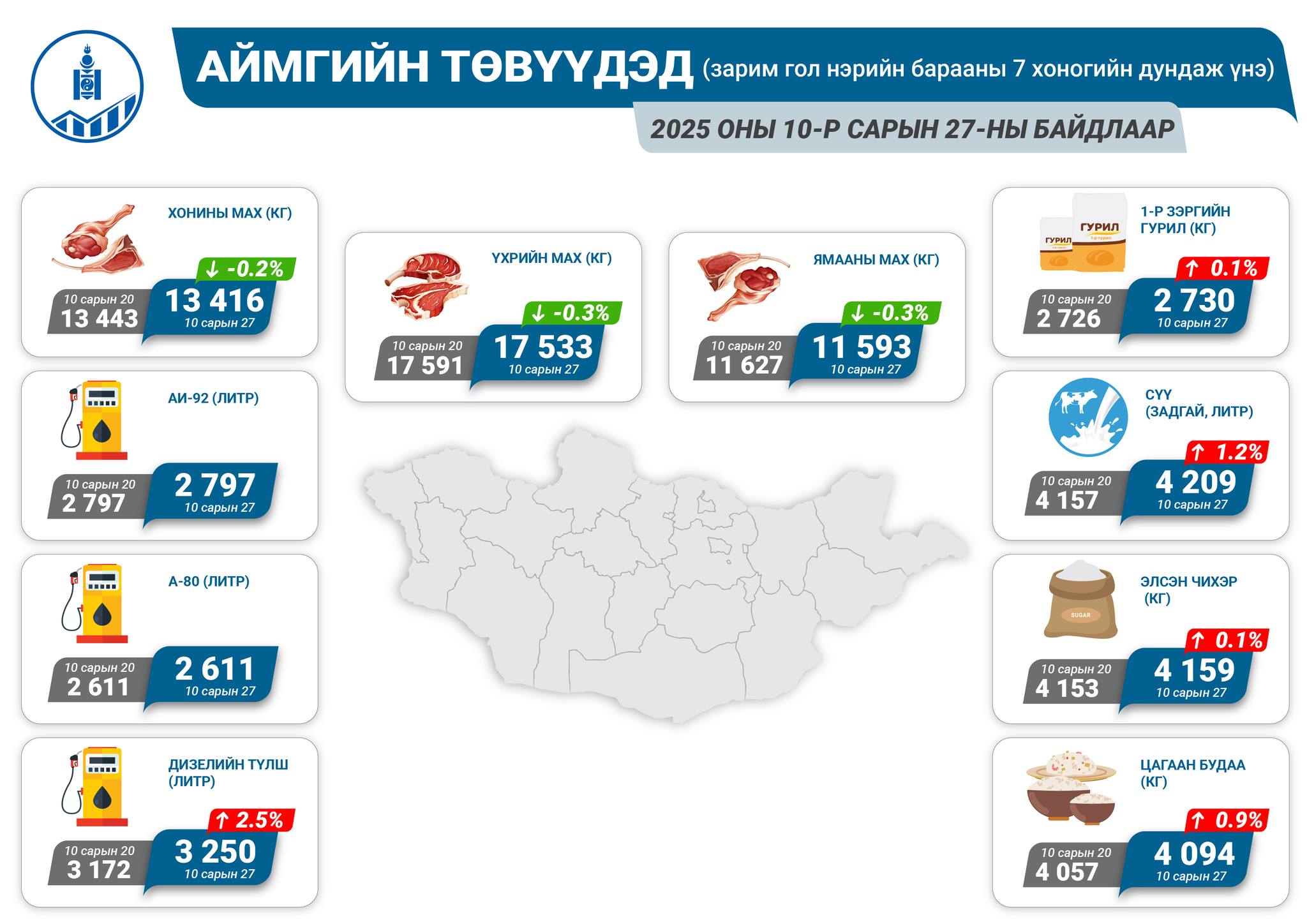 2025 оны 10 дугаар сарын 27-ны байдлаар аймгийн төвүүдэд зарагдаж байгаа гол нэрийн зарим хүнсний барааны дундаж үнэ танилцуулж байна.