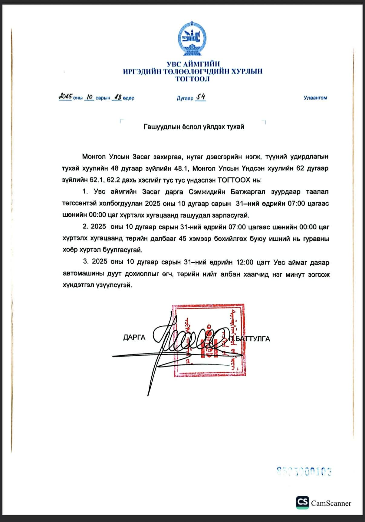 - 2025 оны 10 дугаар сарын 31-ний өдрийн 12:00 цагт Увс аймаг даяар автомашины дуут дохиоллыг өгч, төрийн нийт албан хаагчид нэг минут зогсож хүндэтгэл үзүүлсүгэй.