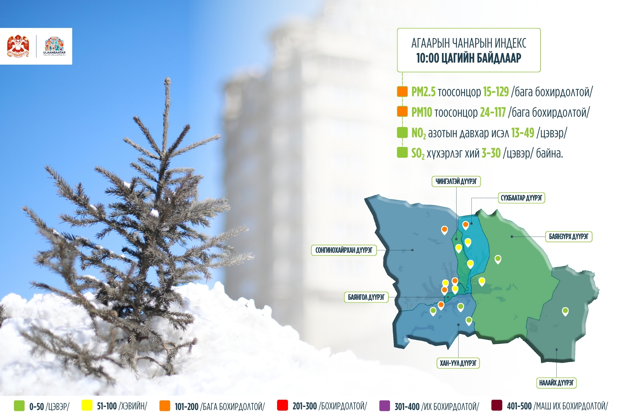 Нисэх, Мишээл экспо, Богд хааны ордон музей, Шархад, Налайх орчим агаар цэвэр байгаа бол 1-р хороолол, Хайлааст, Баруун 4 зам, 5 буудал, 100 айл, Бөхийн өргөө орчим агаар хэвийн байна. Бусад газруудад агаар бага бохирдолтой байна.