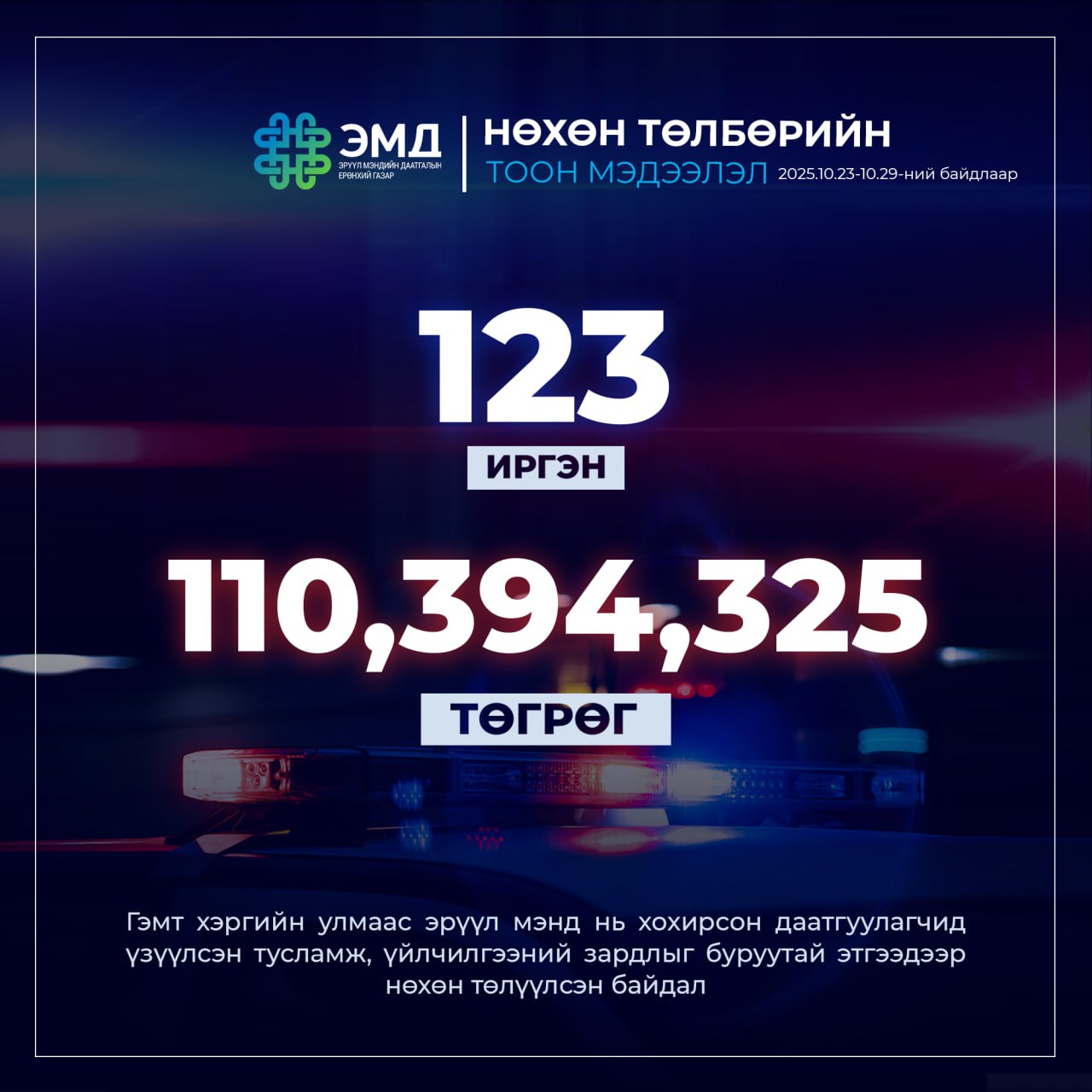 Тэгвэл 2025 оны 10 дугаар сарын 23-ны өдрөөс 10 дугаар сарын 29-ний өдрүүдэд 123 даатгуулагч-иргэнд ЭМД-ын сангаас 110 сая 394 мянга 325 төгрөг зарцуулсныг хуулийн хүрээнд буруутай этгээдээр нөхөн төлүүлж, ЭМД-ын санг хохиролгүй болголоо.