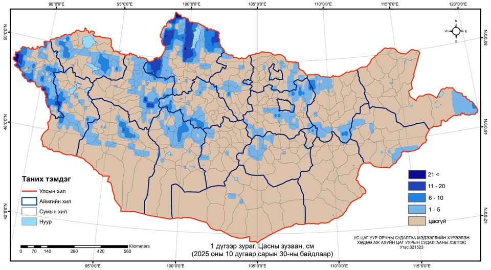 Үүнээс Увсын Цагаанхайрхан, Хөвсгөлийн Цэцэрлэг, Алаг-Эрдэнэ, Ренчинлхүмбэд 10-20 см, Баян–Өлгийн Сагсай, Увсын Хяргас, Ховдын Дуут, Говь-Алтайн Есөнбулаг, Хөвсгөлийн Цагаан-Үүр, Архангайн Булган, Баянхонгорын Галуутад 5-10 см, бусад нутгаар 0-5 см хүртэл зузаан цастай байна.
