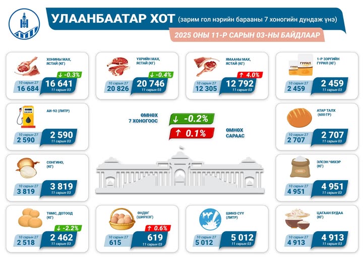 Улаанбаатар хотод 2025 оны арваннэгдүгээр сарын 3-ны байдлаар гол нэрийн зарим барааны үнэ өмнөх сараас 0.1 хувиар өссөн бол өмнөх 7 хоногоос 0.2 хувиар буурсан байна.