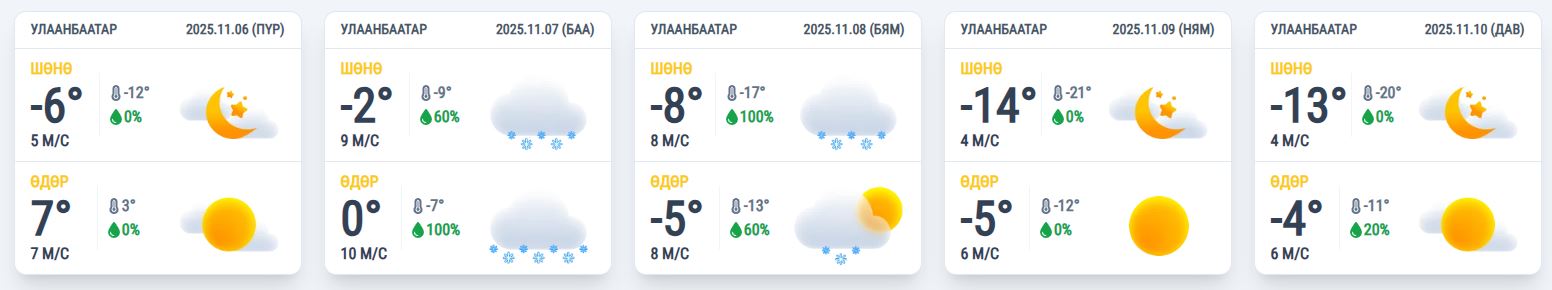 2025 оны 11-р сарын 07-ноос 11-р сарын 11-нийг хүртэлх цаг агаарын урьдчилсан төлөв: