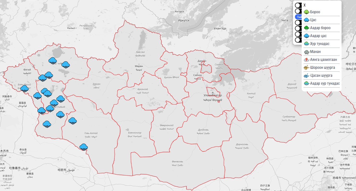 - Ховд - Булган, Дуут, Жаргалант, Манхан, Мянгад, Мөнххайрхан, Мөст, Ховд, Чандмань, Эрдэнэбүрэн, Үенч сумдын нутгаар цас орж байна.