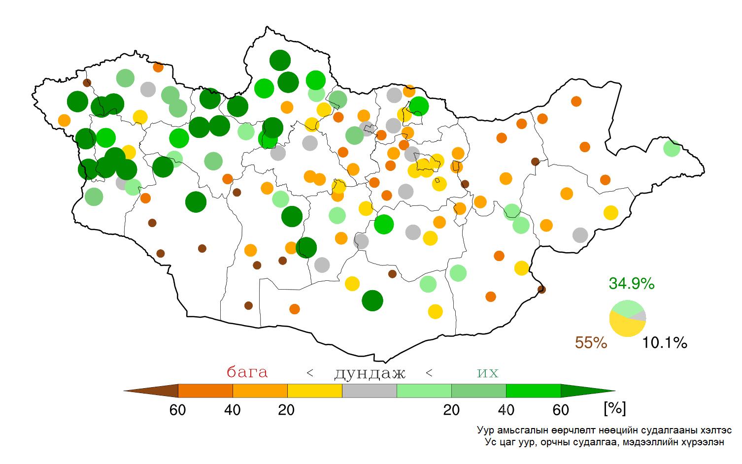Тус сард Монгол орны хэмжээнд дунджаар 6.3 мм хур тунадас орсон нь өмнөх жилээс 43.2%-иар, ОЖД-аас 0.5%-иар бага буюу дунджийн орчим хур тунадас орсон. Сарын нийлбэр хур тунадасны олон жилийн дунджаас хазайх хазайлтыг авч үзвэл нийт нутгийн 34.9% нь дунджаас ахиу, 10.1% нь дунджийн орчим, 55%-д дунджаас бага хур тунадас орсон байна.