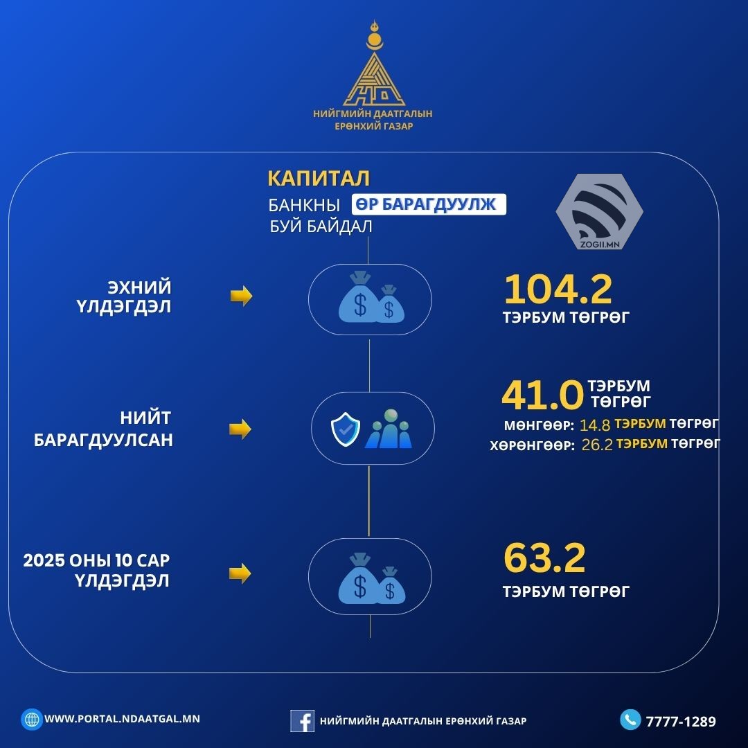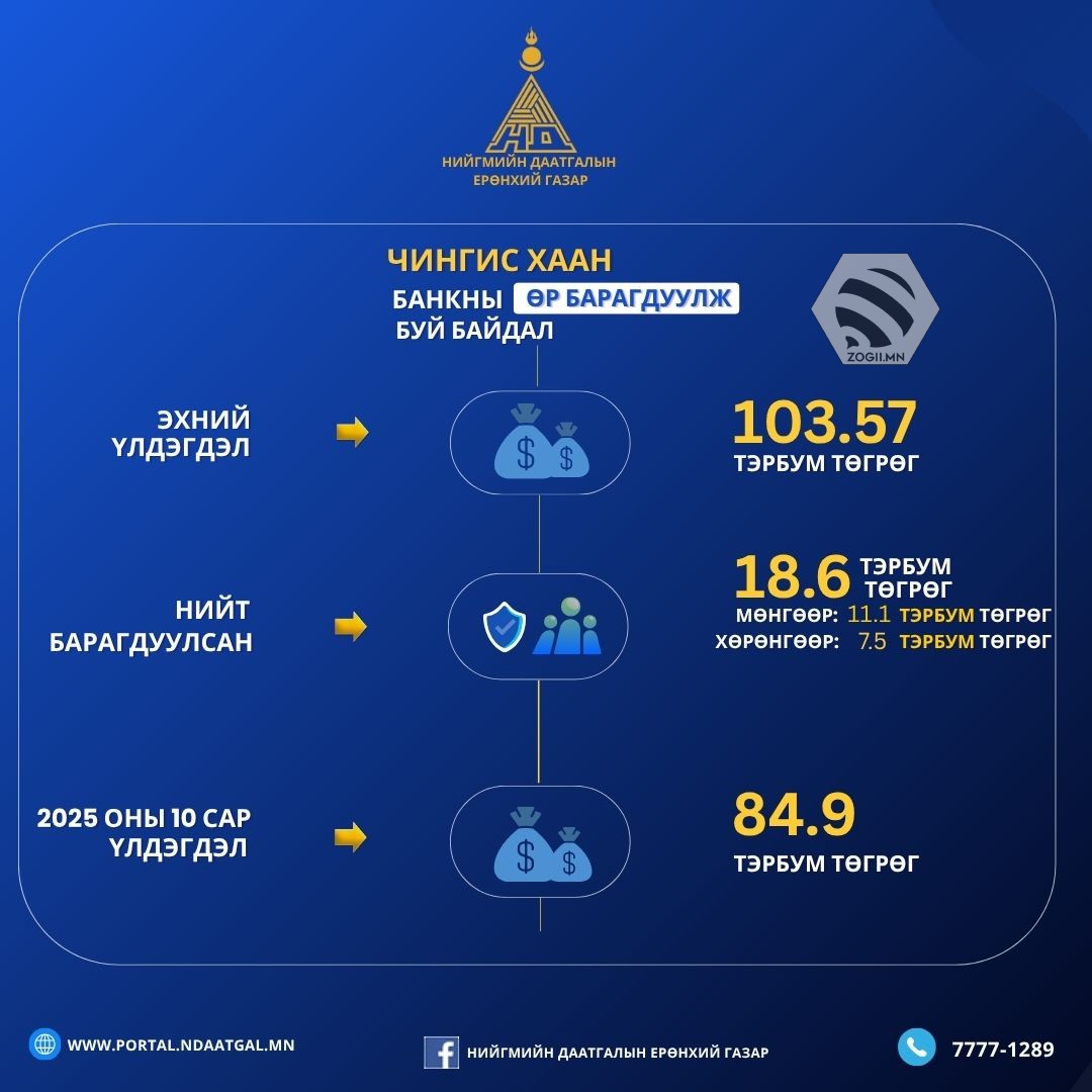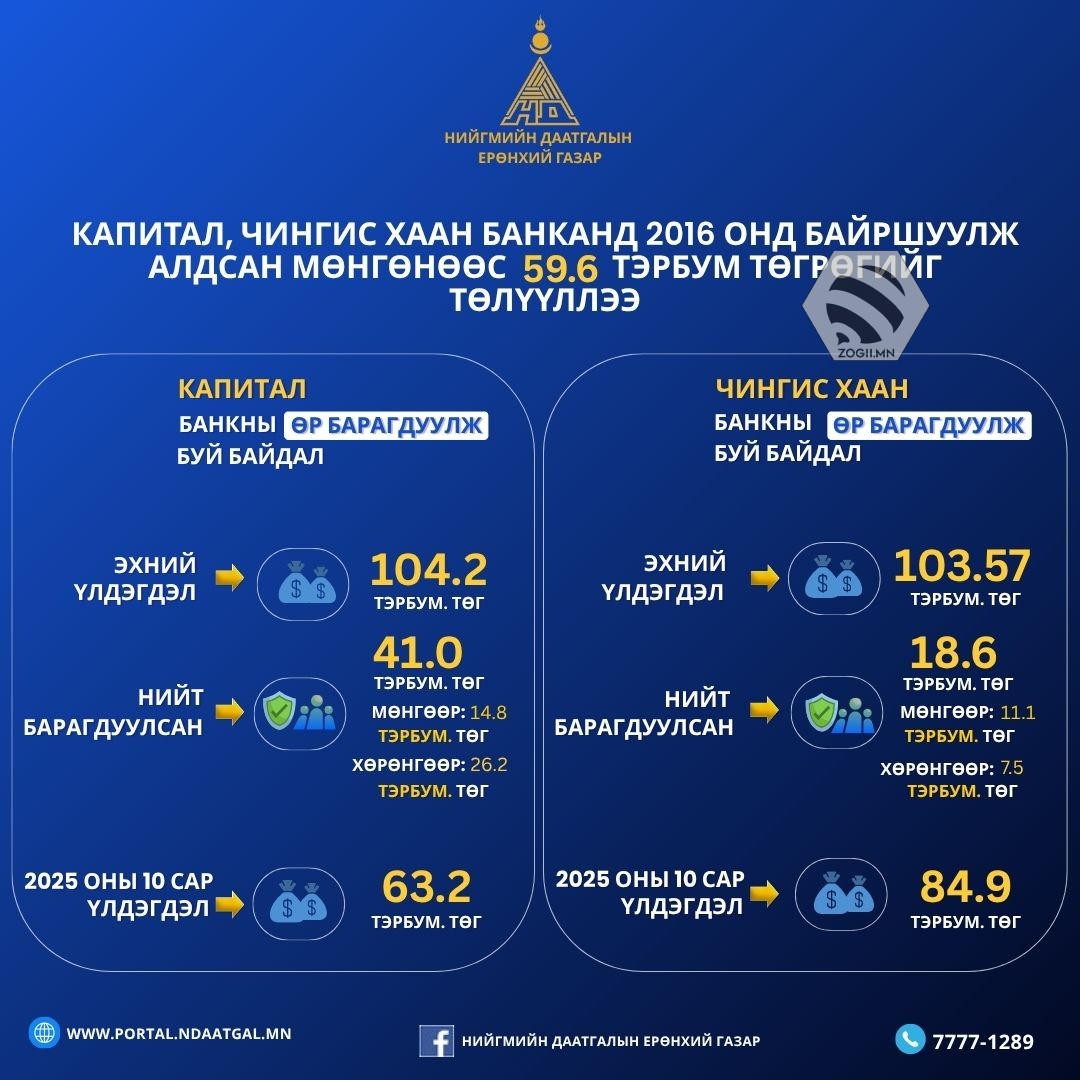 Нийгмийн даатгалын байгууллага Капитал банк болон Чингис хаан банкны нийгмийн даатгалын санд төлөх өр төлбөрийг төлүүлэх ажлыг тасралтгүй зохион байгуулж байна. Энэ ажлын үр дүнд 2025 оны 10 дугаар сарын байдлаар нийт 59.6 тэрбум төгрөгийг төлүүлээд байна.