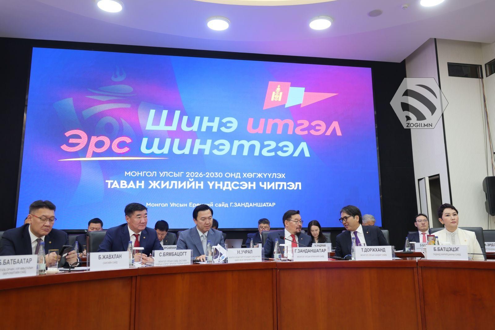 Уулзалтын эхэнд Ерөнхий сайд Г.Занданшатар ирэх таван жилийн хөгжлийн үндсэн чиглэлийг танилцууллаа. Тэрбээр Монгол Улсын Үндсэн хуулийн 27.1.5-д хөгжлийн бодлого, төлөвлөлт тогтвортой байна гэж заасан. Бид өнгөрсөн 30 жилийн замналаасаа суралцаж, дараагийн шатны зам мөрөө тодорхойлох учиртай. Засгийн газар өөрчлөгдөх болгонд бодлого өөрчлөгддөг замбараагүй байдал өнгөрсөн хугацааны гол алдаа байсан гэлээ. Ирэх таван жилийн хөгжлийн үндсэн чиглэлийг боловсруулахдаа Хөгжлийн бодлого, төлөвлөлтийн тухай хуулийн дагуу шинжлэх ухааны үндэслэлтэй, олон нийтийн санал бодолд нийцүүлэн, төлөвлөлт, хэрэгжилтийн шатанд нэгдмэл, уялдаатай, үйл ажиллагаа, үнэлгээ нэг чиг, нэг зорилготой байх зарчмыг баримталжээ.