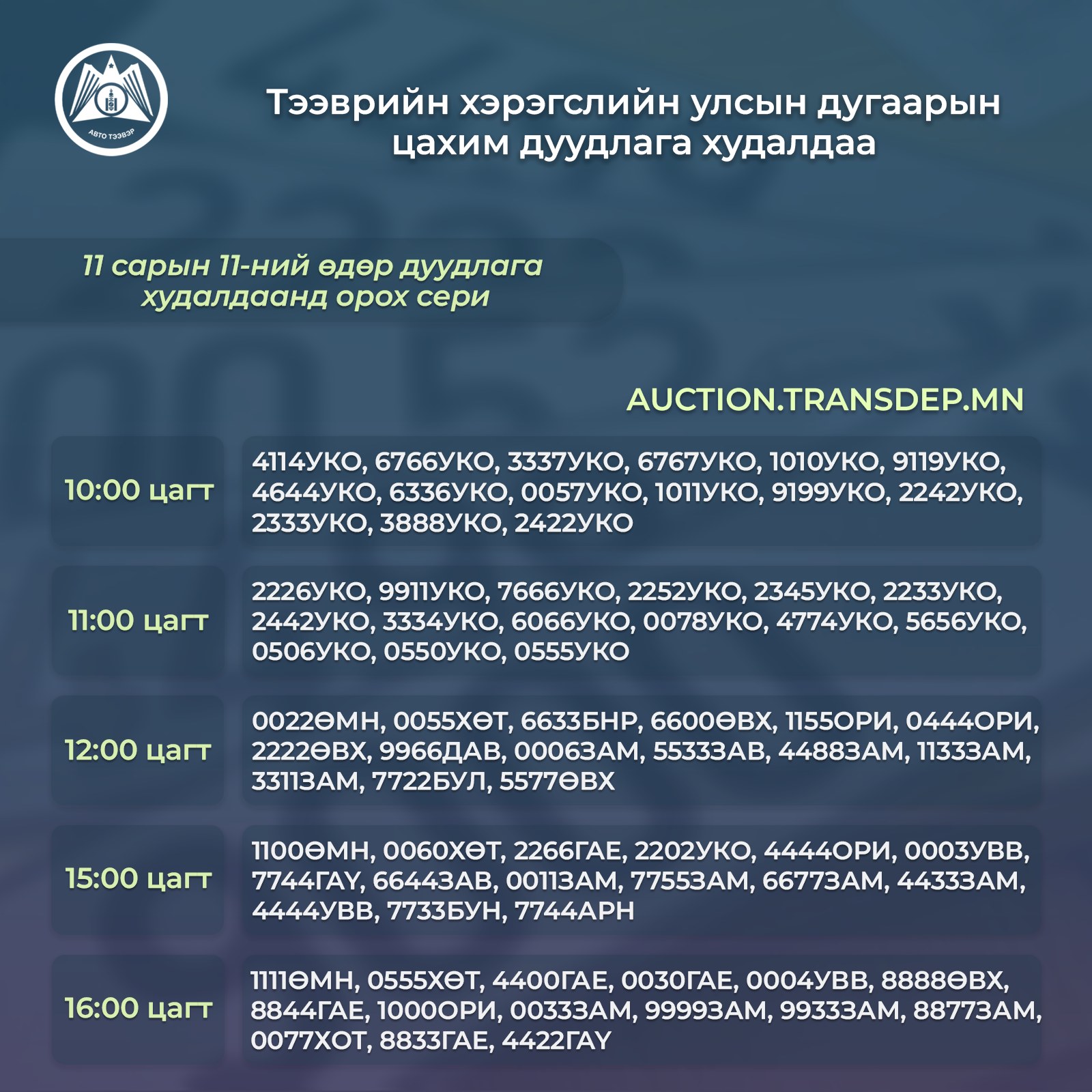 Тээврийн хэрэгслийн улсын дугаарын дуудлага худалдаа арваннэгдүгээр сарын 11-ний өдөр 10:00, 11:00, 12:00, 15:00, 16:00 цагуудад зохион байгуулагдана.