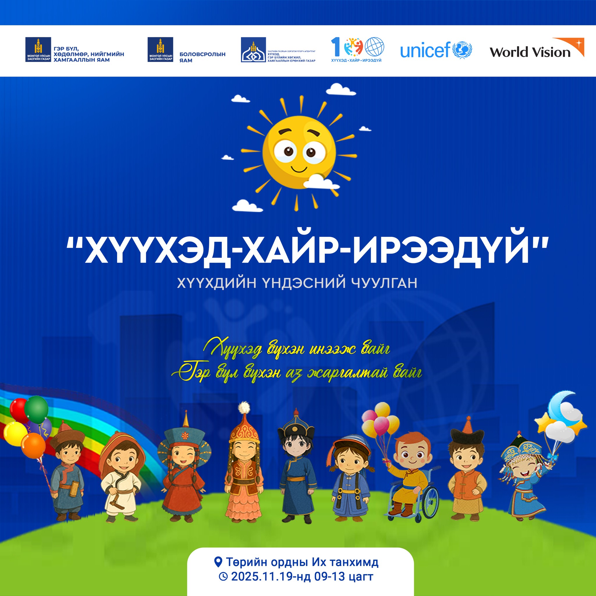 Монгол Улсад хүүхдийн байгууллага, хөдөлгөөн үүсэж, хөгжсөний түүхт жилийн арга хэмжээний хүрээнд “Хүүхэд-Хайр-Ирээдүй” хүүхдийн үндэсний чуулганыг 2025 оны 11 дүгээр сарын 19-ний өдөр Төрийн ордны Их танхимд зохион байгуулах гэж байна.