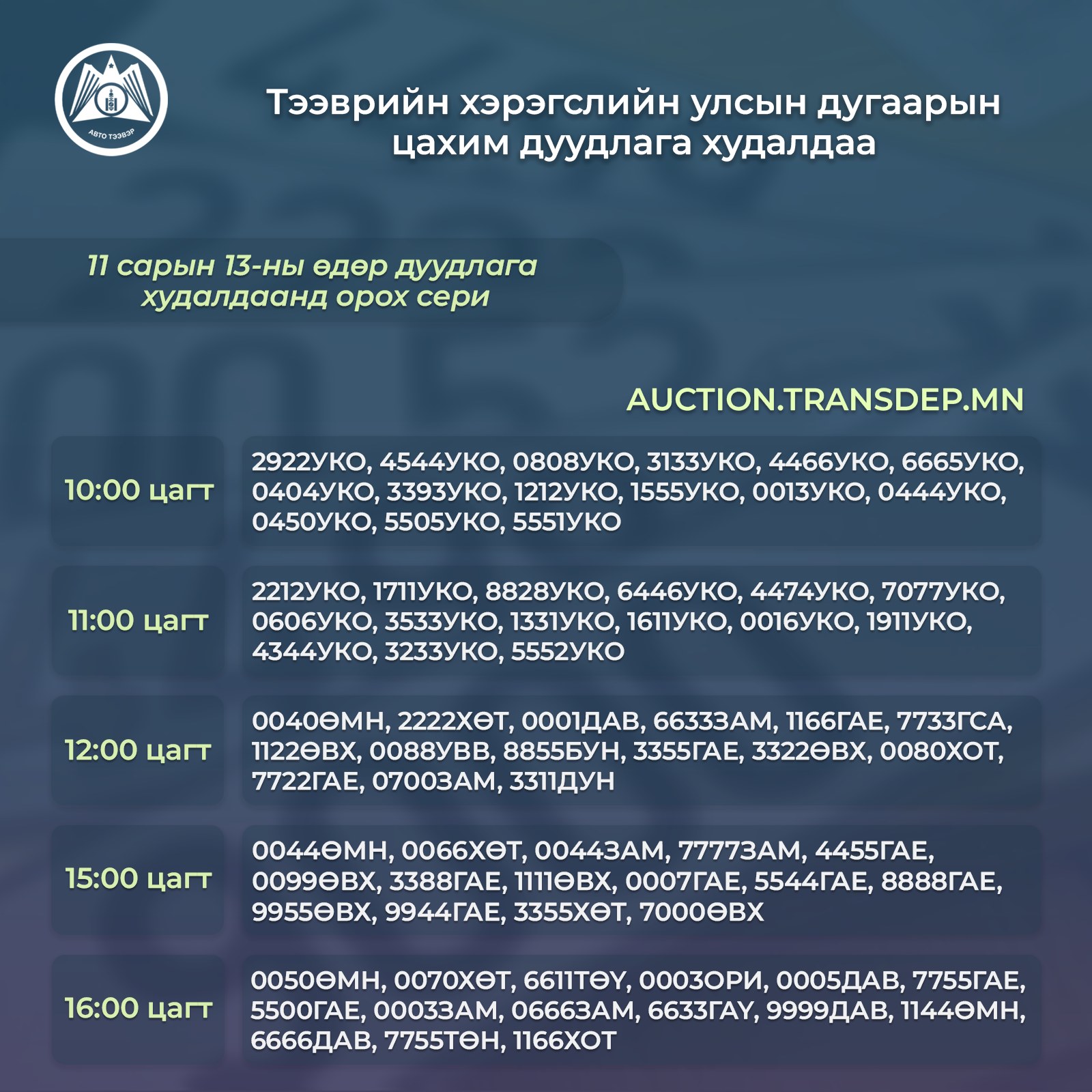 Автомашины азын дугаарын дуудлага худалдаа арваннэгдүгээр сарын 13-ны өдөр 10:00, 11:00, 12:00, 15:00, 16:00 цагуудад зохион байгуулагдана.