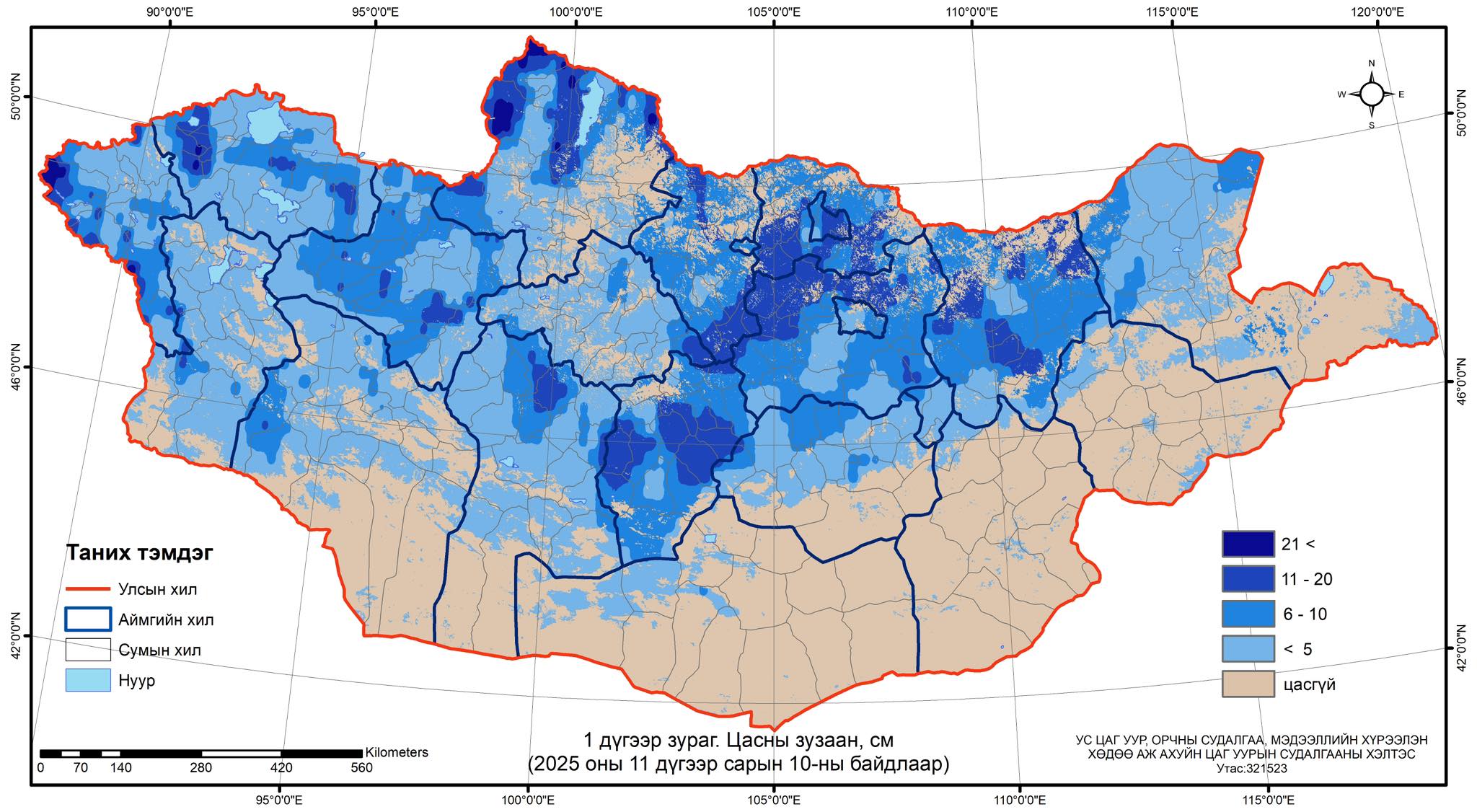 2025 оны 11 дүгээр сарын 10-ны байдлаар нийт нутгийн 68 хувьд цастай байгаагаас Увсын Малчин, Хөвсгөлийн Алаг-Эрдэнэ, Архангайн Хашаат, Баянхонгорын Галуут, Өвөрхангайн Нарийнтээл, Баянгол, Арвайхээр, Булганы Дашинчилэн, Рашаант, Баяннуур, Сэлэнгийн Орхон, Баянгол, Хушаат, Дархан-Уулын Орхон, Төвийн Заамар, Батсүмбэр, Цээл, Борнуур, Угтаалцайдам, Лүнд 11-20 см, Завхан, Булган, Өвөрхангай, Сэлэнгэ, Төв, Хэнтийн ихэнх нутгаар 6-10 см, бусад нутгаар 5 см-ээс бага цастай байна.