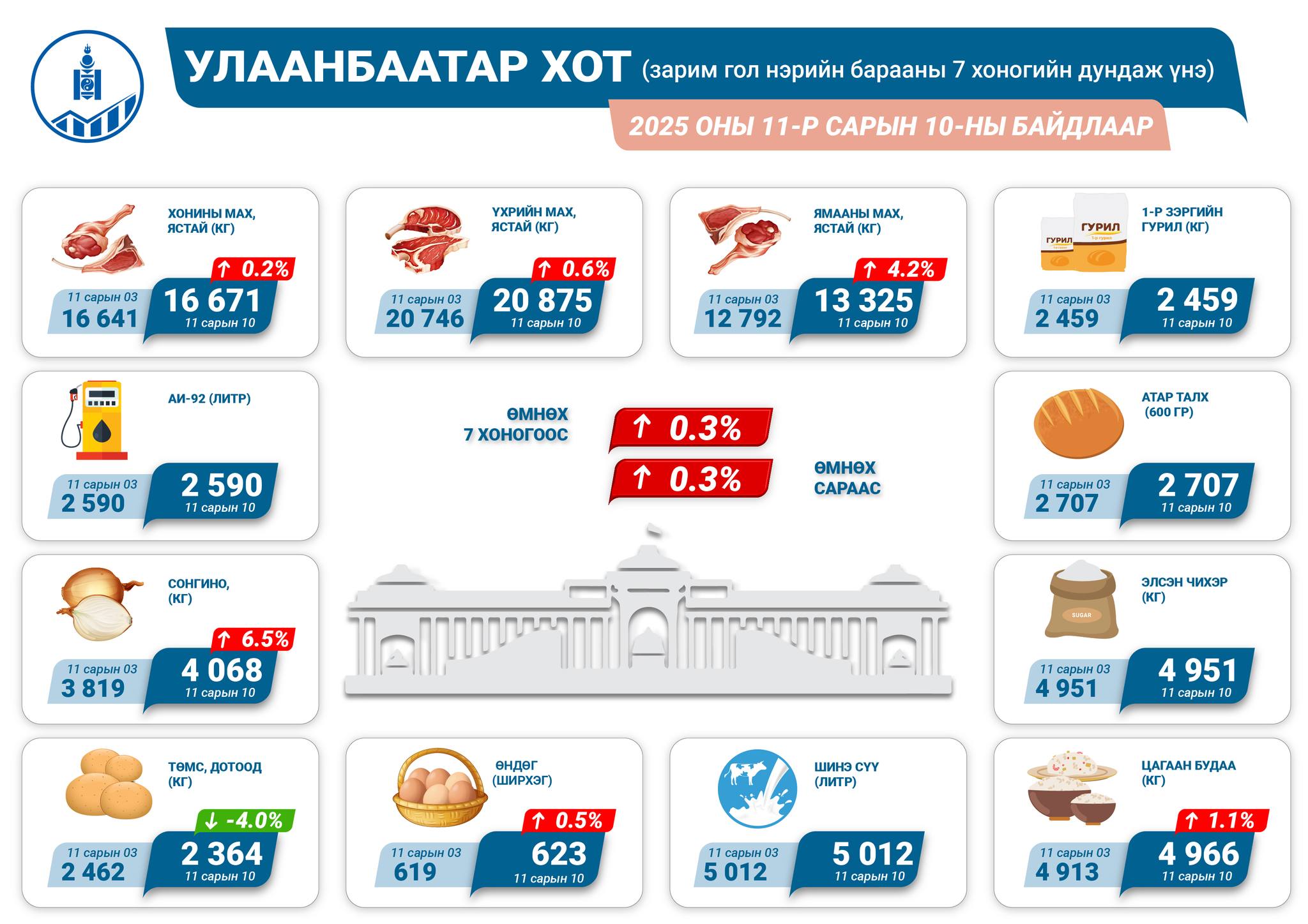 Улаанбаатар хотод 2025 оны 11 дүгээр сарын 10-ны байдлаар гол нэрийн зарим барааны үнэ өмнөх сараас 0.3 хувь, өмнөх 7 хоногоос 0.3 хувиар тус тус өссөн байна.