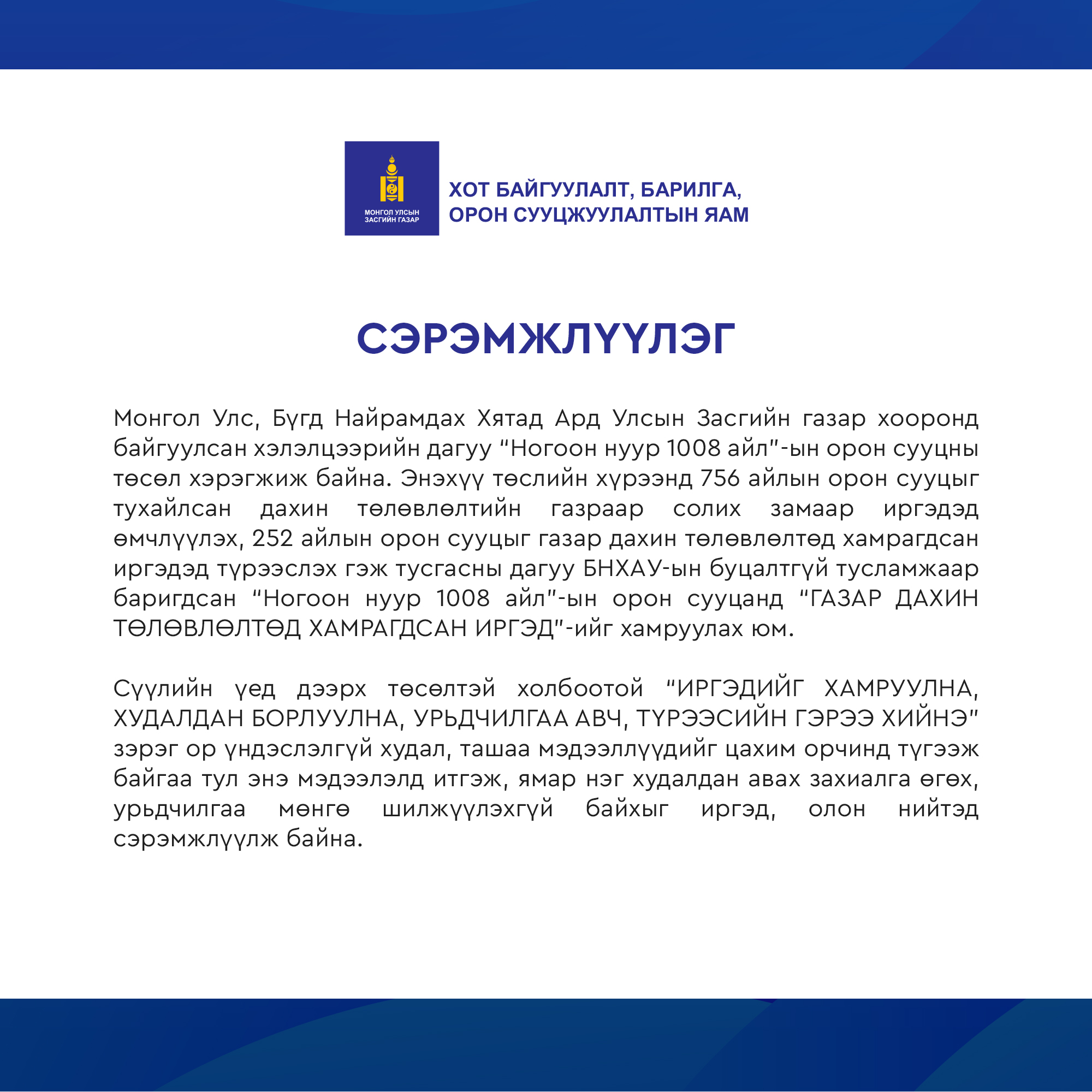 Хот байгуулалт, барилга, орон сууцжуулалтын яамнаас сэрэмжлүүлэг гаргалаа.