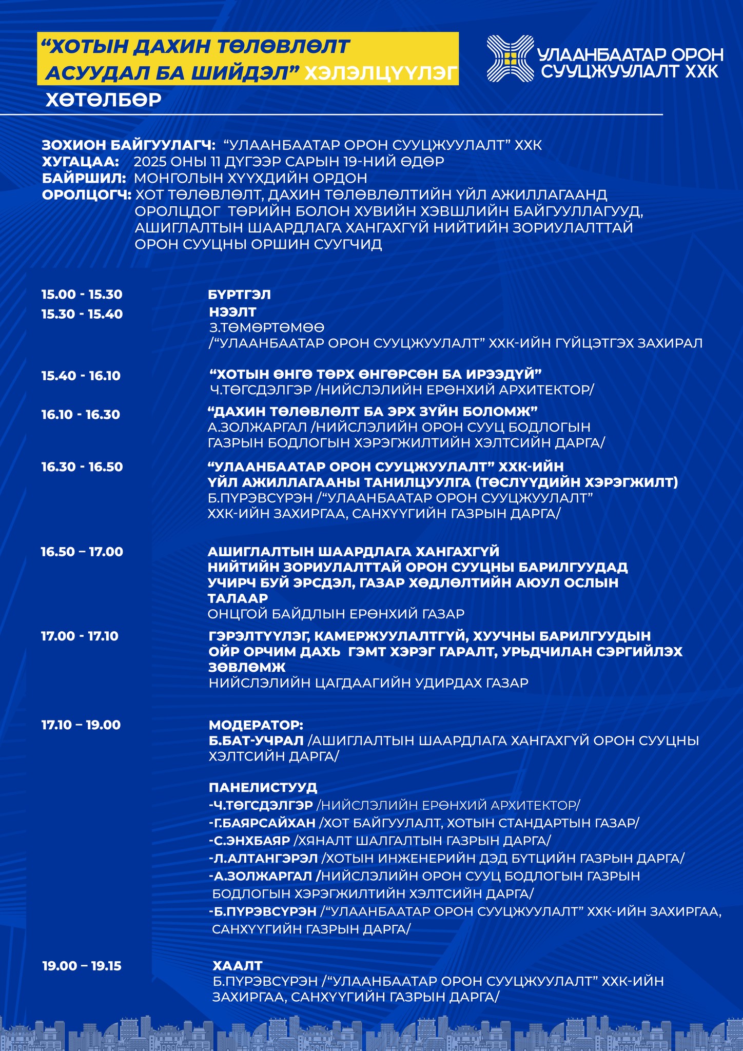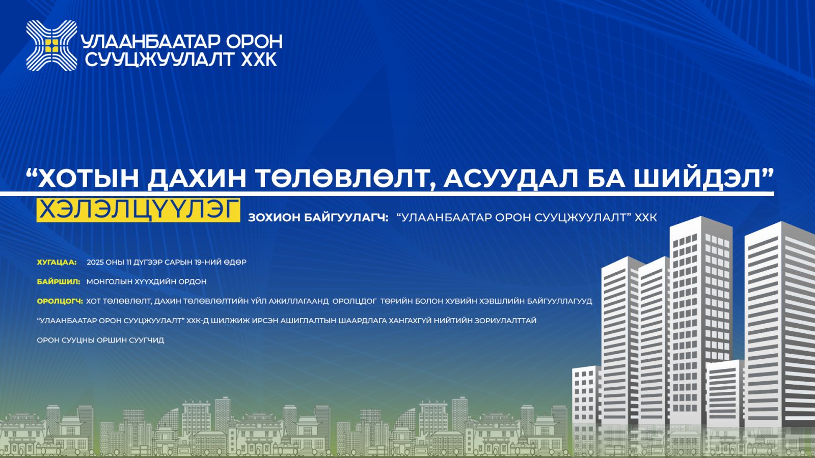 "Улаанбаатар орон сууцжуулалт" ХХК нь нийслэлийн дахин төлөвлөлтийн үйл ажиллагааны оролцогч талуудын уялдаа холбоог сайжруулах, төслүүдийн хэрэгжилтийг хурдасгах зорилгоор тус хэлэлцүүлгийг зохион байгуулж байна.