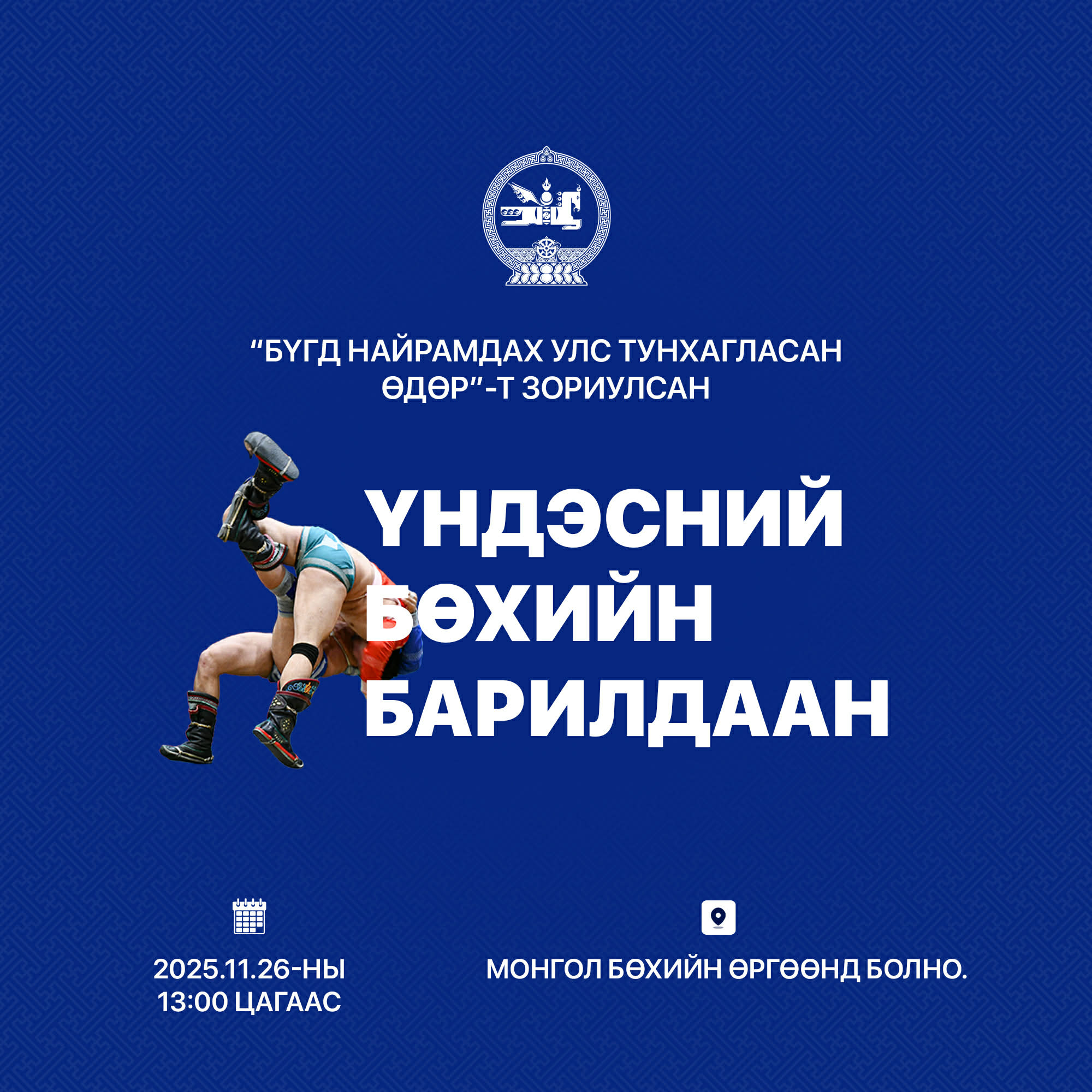 Улс тунхагласны 60 жилийн ойн өдрөөр анх 1984 онд Спортын төв ордонд 128 бөх барилдсанаас дархан аварга Х.Баянмөнх түрүүлж, аварга Д.Хадбаатар үзүүрлэж байжээ. 1990 оноос хойш өнөөг хүртэл тогтмол зохион байгуулсаар ирсэн энэхүү барилдаан өнөө жил Монгол бөхийн өргөөнд үндэсний бөхийн барилдаан явагдана.