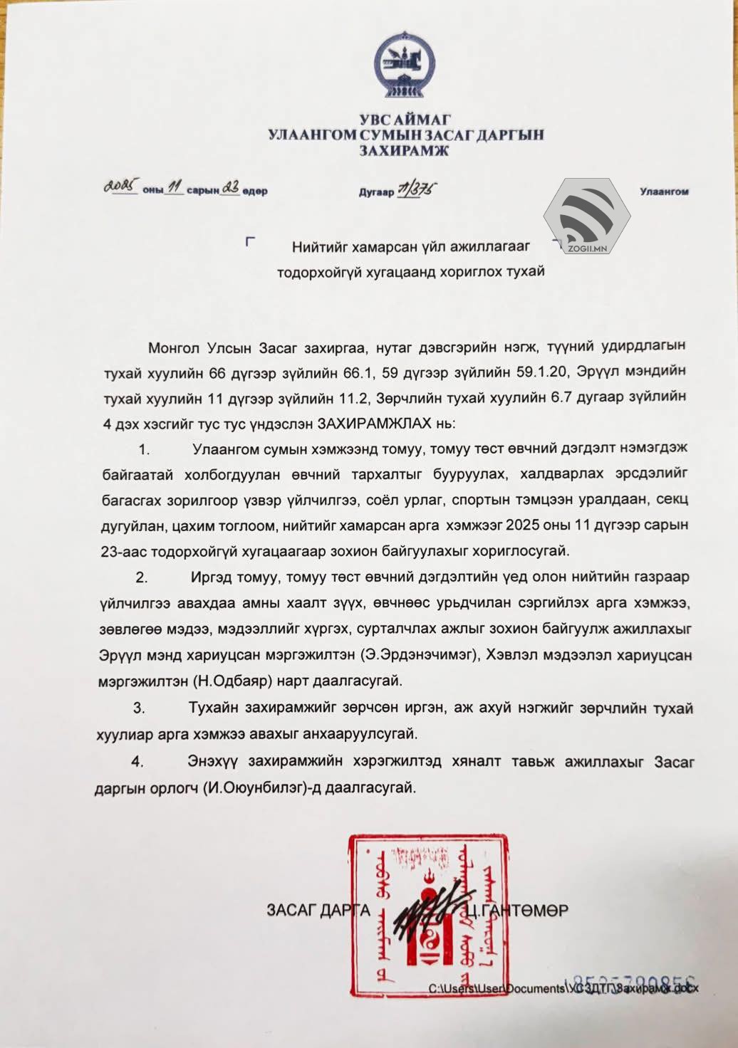 Увс аймгийн Улаангом сумын засаг даргын захирамжаар сумын хэмжээнд нийтийг хамарсан үйл ажиллагааг тодорхойгүй хугацаанд хориглолоо.