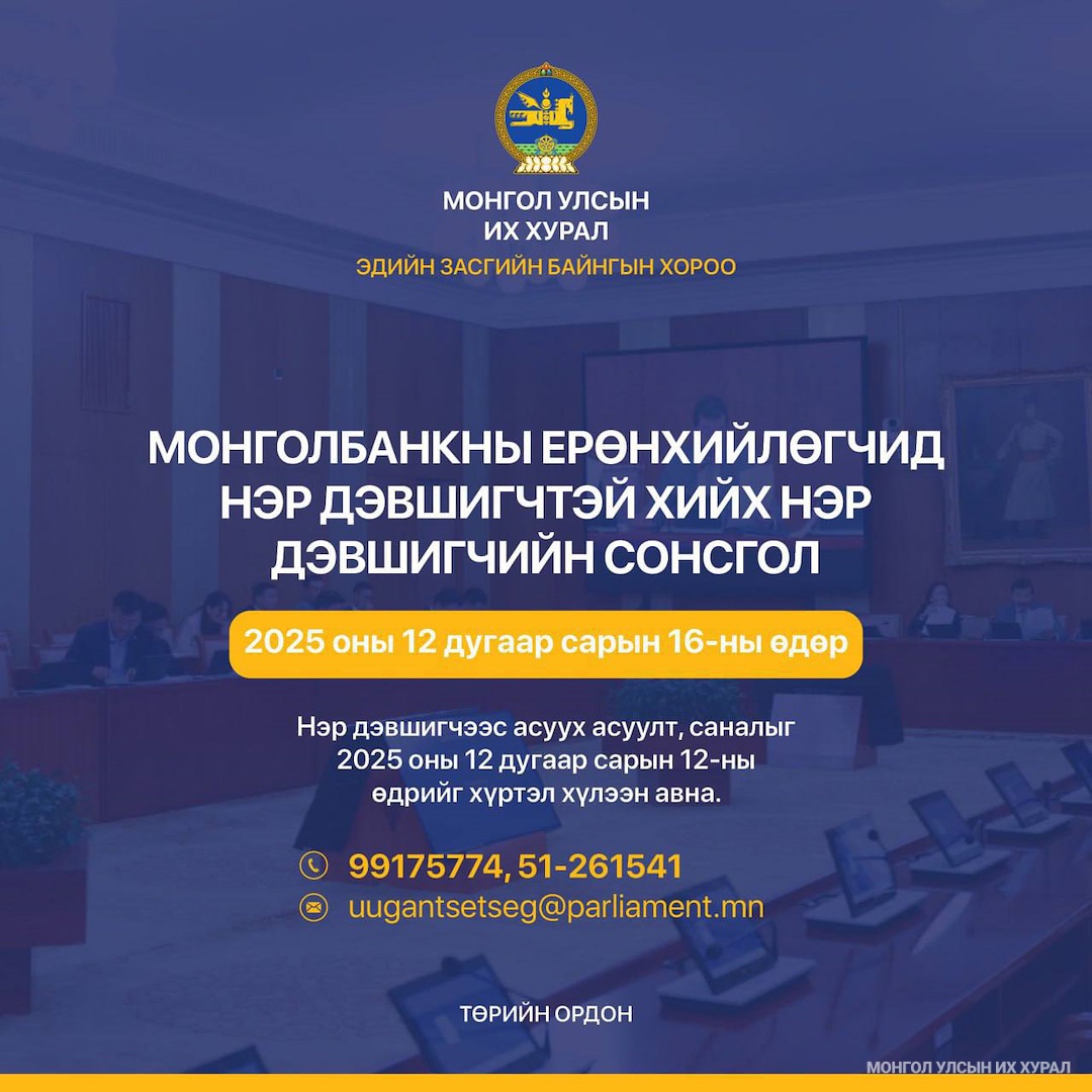 Улсын Их Хурлын Эдийн засгийн байнгын хороо 2025 оны 12 дугаар сарын 16-ны өдрийн 10.00 цагт Төрийн ордны “Жанжин Д.Сүхбаатар” танхимд Монголбанкны Ерөнхийлөгчийн албан тушаалд нэр дэвшигчтэй хийх нэр дэвшигчийн сонсголыг зохион байгуулна.