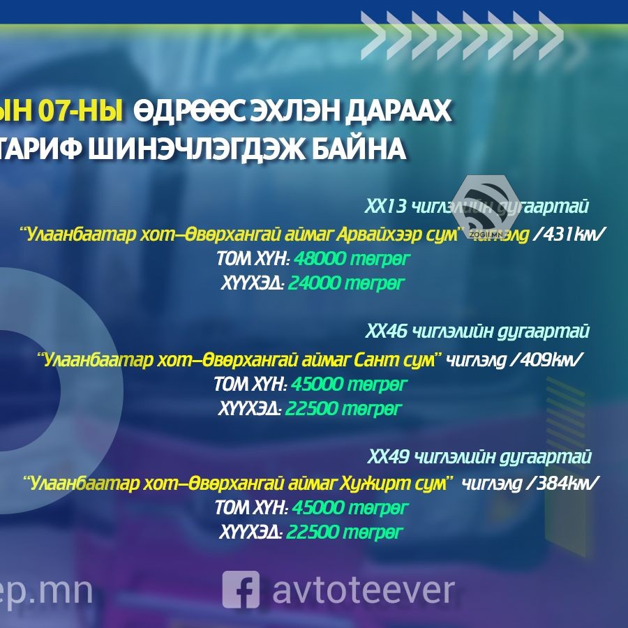 - ХХ49 чиглэлийн дугаартай "Улаанбаатар хот - Өвөрхангай аймаг Хужирт сум" чиглэлүүдийн үйлчилгээний үнэ тариф шинэчлэгдлээ.