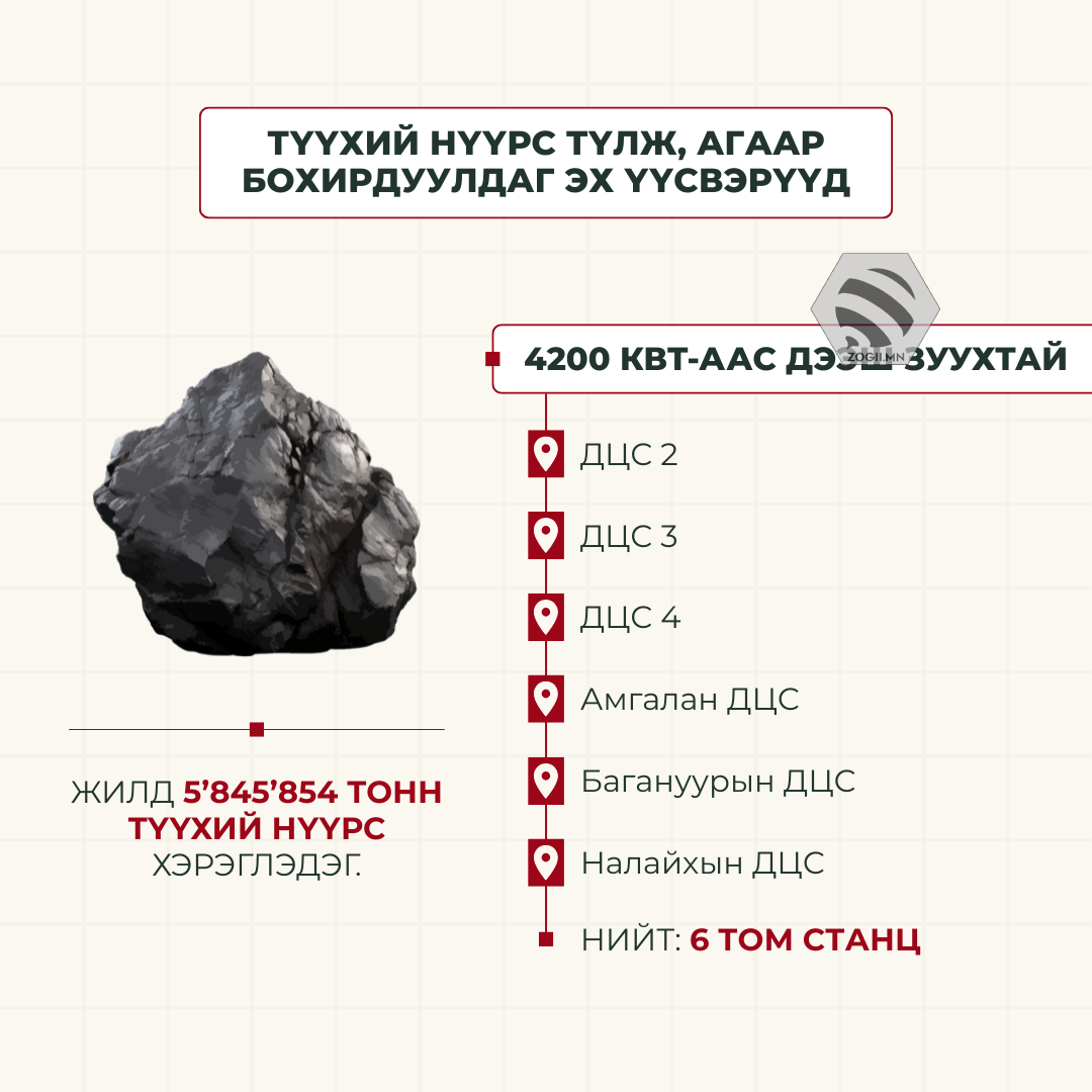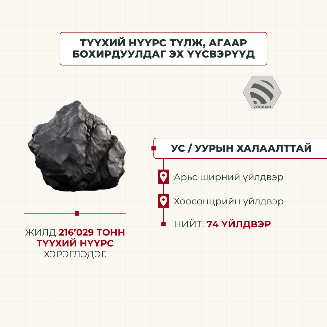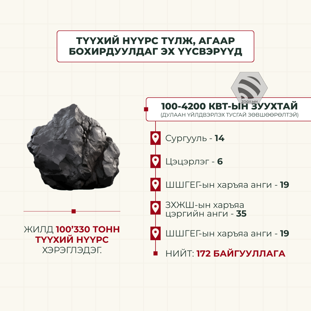 Харин Улаанбаатар хотын хэмжээн дэх нийт уурын болон усан халаалтын зуухнуудад жил бүр 6.3 сая гаруй тонн түүхий нүүрс түлдэг байна.