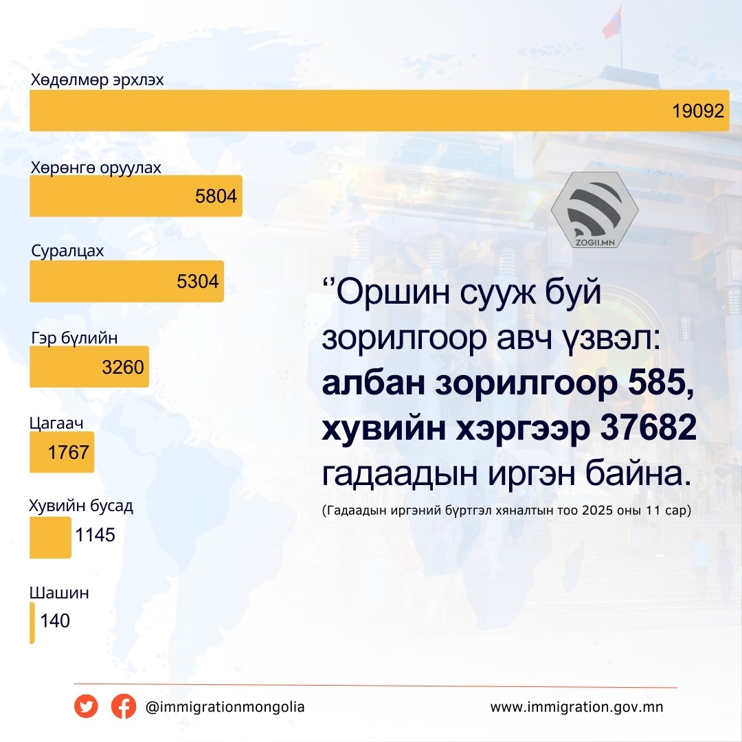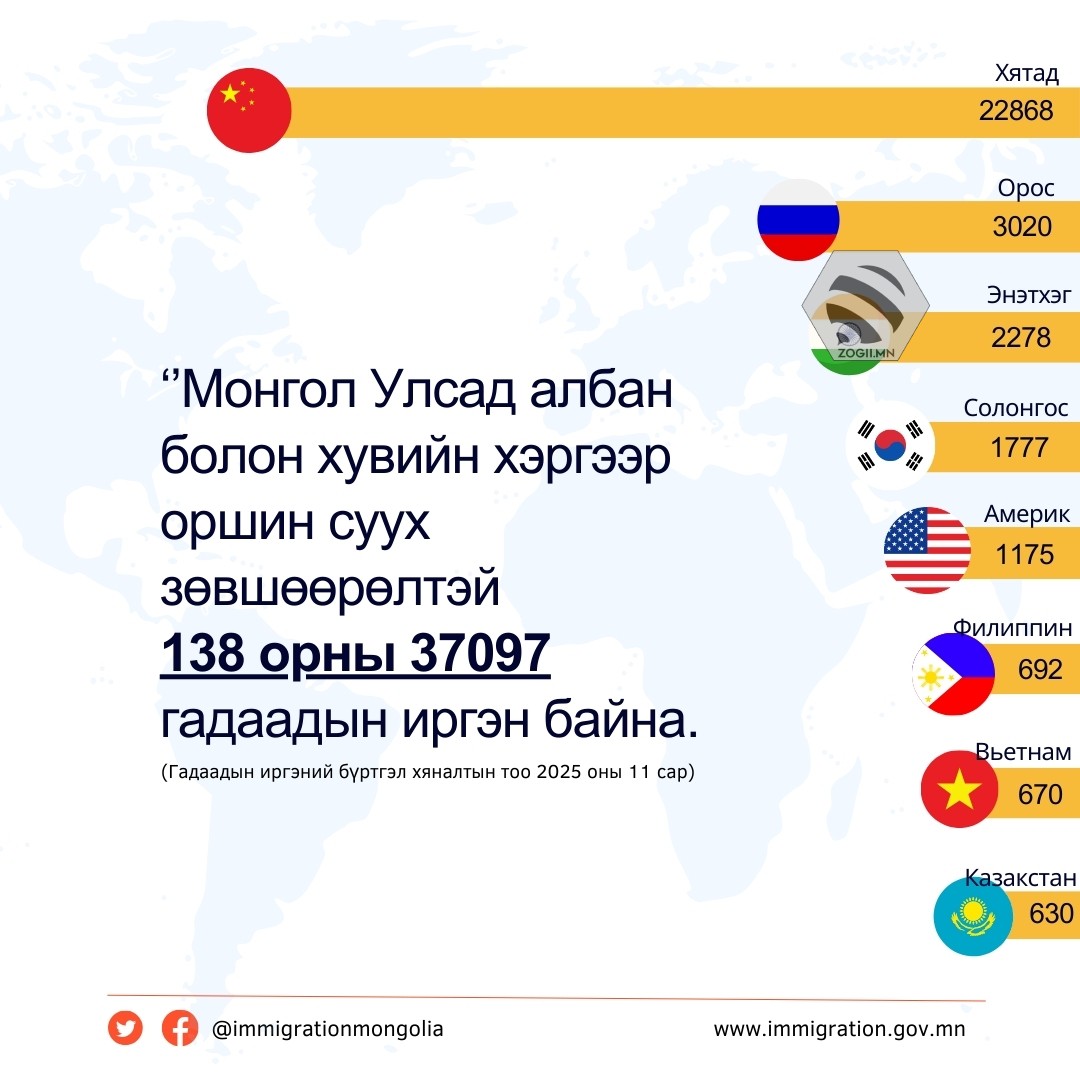 Монгол Улсад 2025 оны 11 дүгээр сарын 30-ны өдрийн байдлаар 138 улсын 37097 гадаадын иргэн албан болон хувийн хэргээр оршин суух бүртгэлтэй байна. Эдгээр иргэдийг улсаар нь авч үзвэл АНУ-ын 1175, БНСУ-ын 1777, БНЭУ-ын 2278, ОХУ-ын 3020, БНХАУ-ын 22868, иргэн, бусад улсын 5979 иргэн байна.