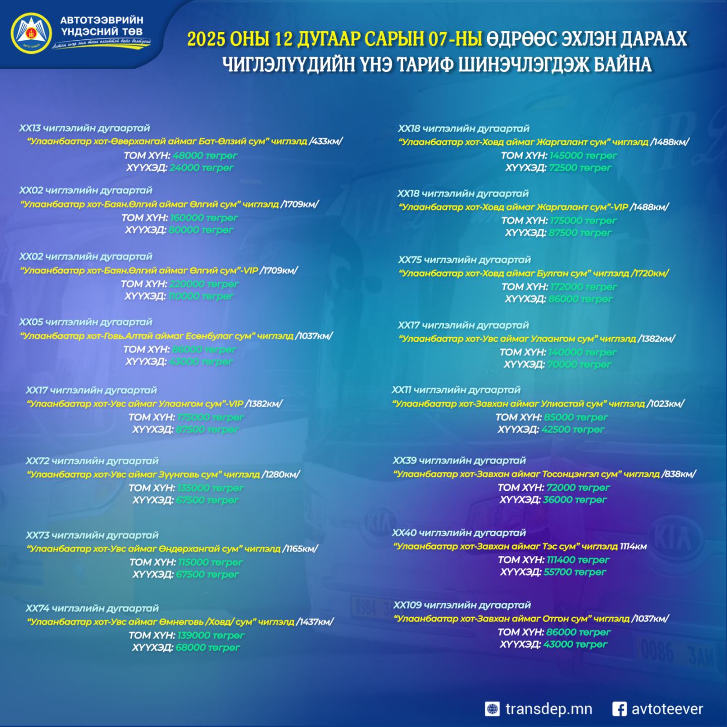 2025 оны 12 дугаар сарын 07-ны өдрөөс эхлэн доорх чиглэлүүдийн үнэ тариф шинэчлэгдэж байна.