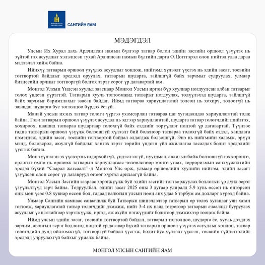 Монгол Улсын Сангийн яамнаас мэдэгдэл гаргажээ. Уг мэдэгдэлд:
