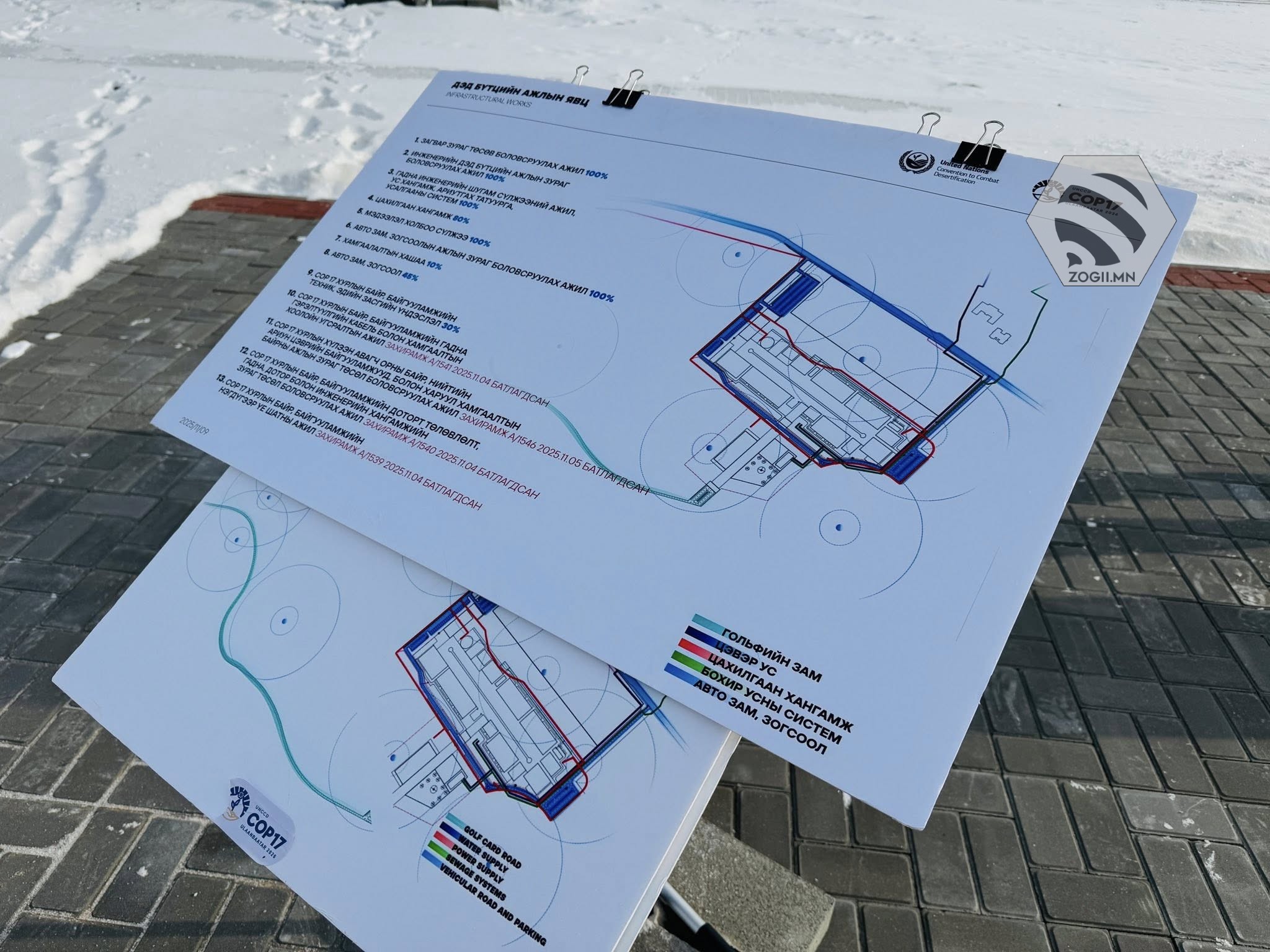 Авто зам болон зогсоол барих ажил 45 хувийн гүйцэтгэлтэй байна. Хүйтний эрч чангарсан учраас зам талбайн ажлуудыг түр хугацаанд зогсоожээ. Ирэх оны гуравдугаар сард үндсэн бүтээн байгуулалтууд өрнөх юм байна.