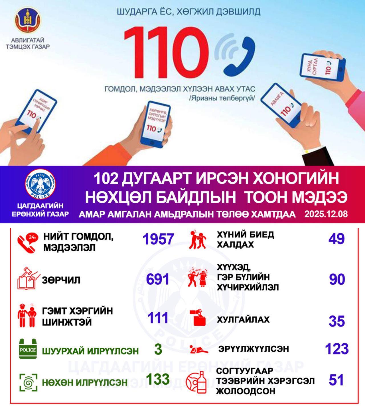 Цагдаагийн байгууллагын 102 тусгай дугаарт 2025 оны 12 дугаар сарын 08-ны өдөр нийт 1957 дуудлага, мэдээлэл бүртгэгдсэнээс зөрчлийн шинжтэй 691, гэмт хэргийн шинжтэй 111 дуудлага, мэдээлэл байна.