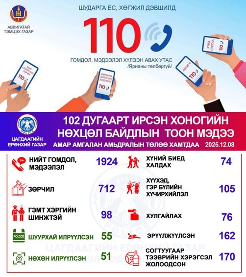 Цагдаагийн байгууллагын 102 тусгай дугаарт 2025 оны арванхоёрдугаар сарын 10-ны өдөр нийт 1924 дуудлага, мэдээлэл бүртгэгдсэнээс зөрчлийн шинжтэй 712, гэмт хэргийн шинжтэй 98 дуудлага, мэдээлэл байна.
