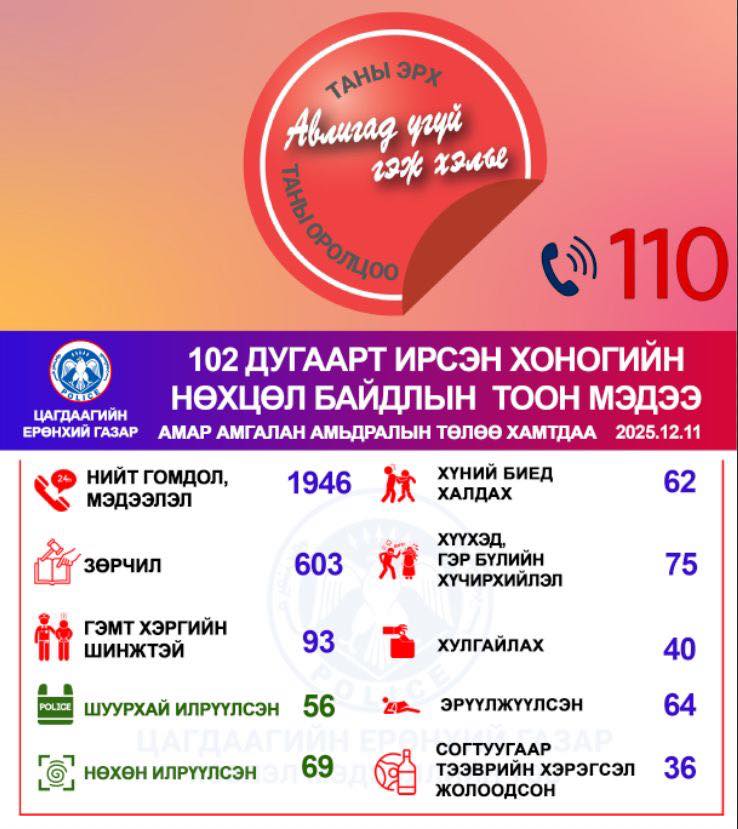 Цагдаагийн байгууллагын 102 тусгай дугаарт 2025 оны 12 дугаар сарын 11-ний өдөр нийт 1946 дуудлага, мэдээлэл бүртгэгдсэнээс зөрчлийн шинжтэй 603, гэмт хэргийн шинжтэй 93 дуудлага, мэдээлэл байна.