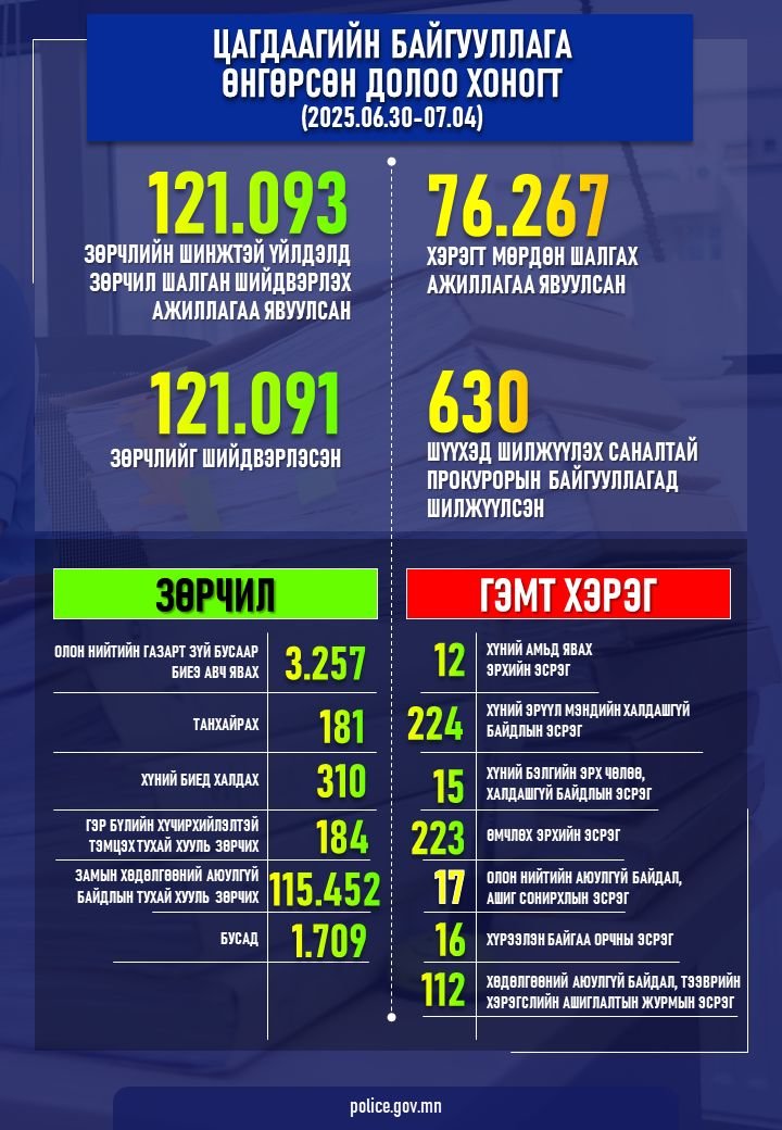 Цагдаагийн байгууллагаас энэ оны эхний хагас жилийн байдлаар 76,267 хэрэгт мөрдөн шалгах ажиллагаа явуулж, өнгөрсөн 7 хоногт 630 хэргийг нь шүүхэд шилжүүлэх саналтай прокурорын байгууллагад хүргүүлсэн байна. Үүнээс: