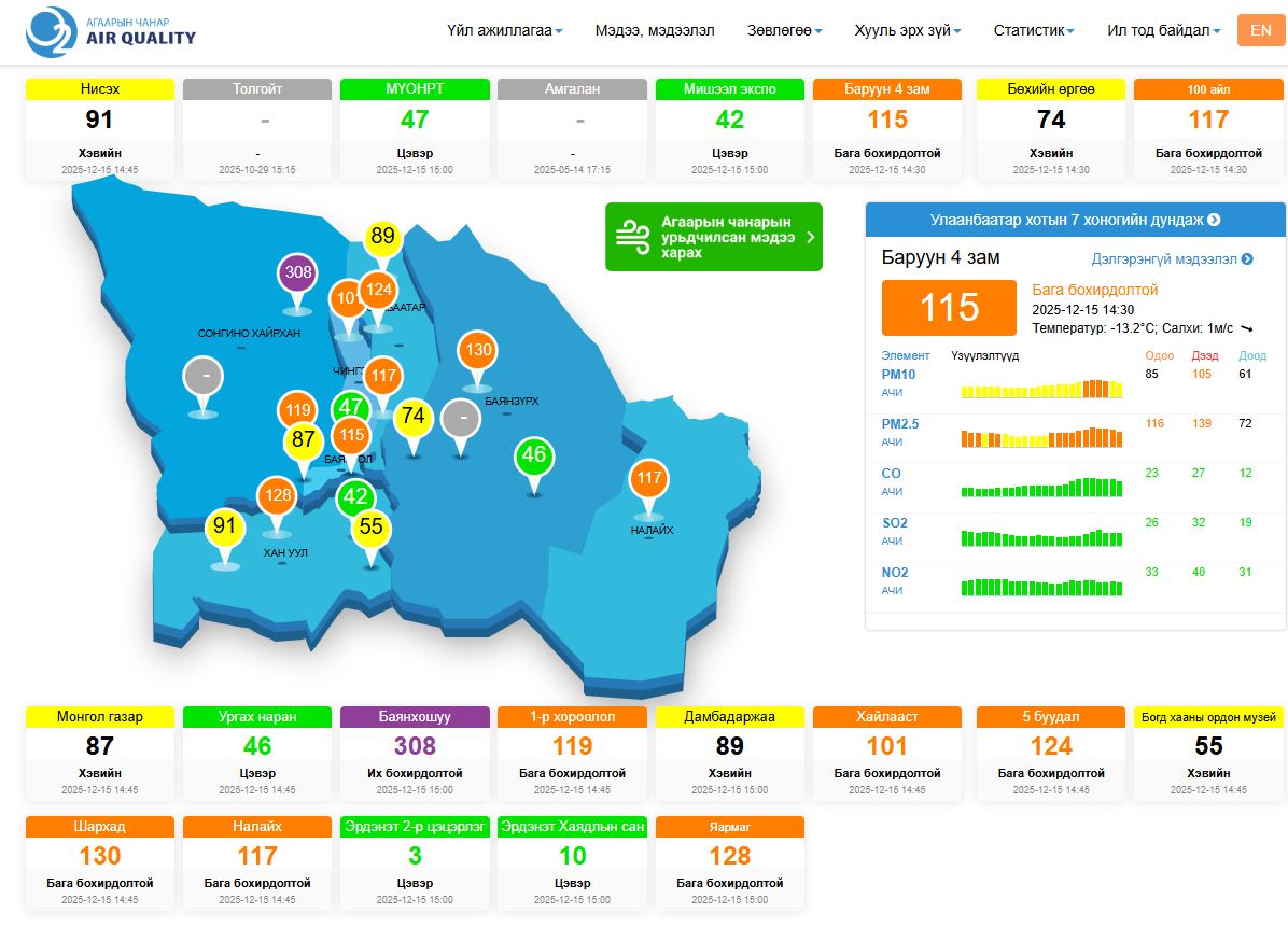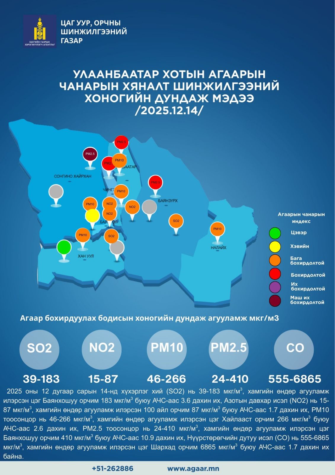 Улаанбаатар хотын агаарын чанарын /2025.12.15/ мэдээг танилцуулж байна.