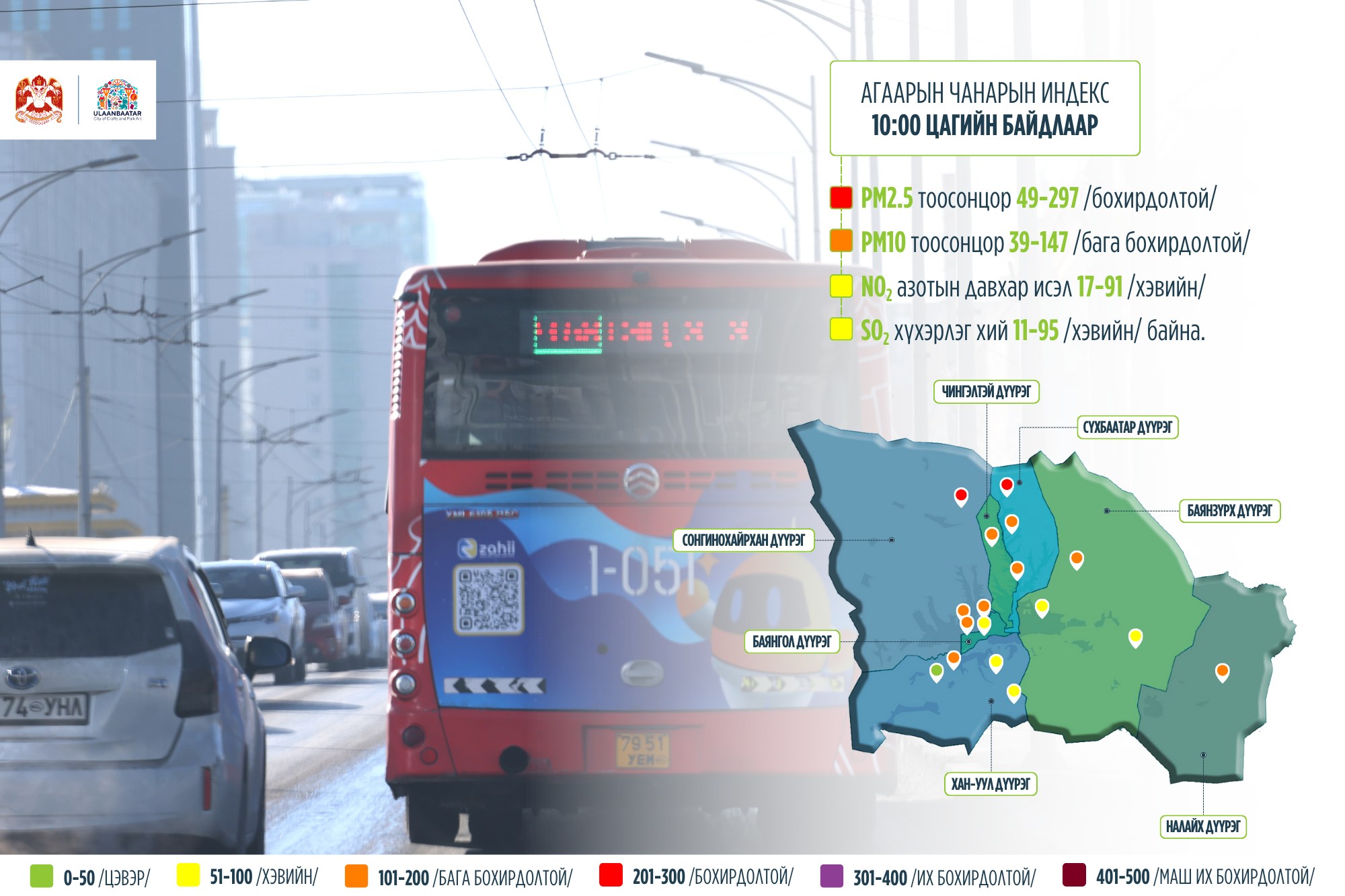 Баянхошуу, Дамбадаржаа орчимд агаар бохирдолтой байгаа бол Яармаг, 1-р холоолол, Монгол газар, МҮОНРТ, Хайлааст, 5 буудал, 100 айл, Шархад, Налайх орчимд агаар бага бохирдолтой байна.