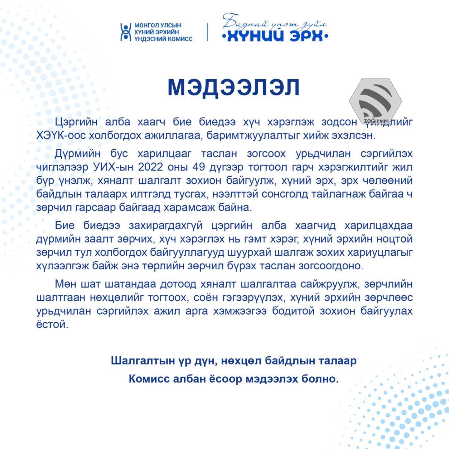 ХЭҮК: Цэргийн алба хаагч бие биедээ хүч хэрэглэн зодсон үйлдлийг ХЭҮК-оос холбогдох ажиллагаа, баримтжуулалтыг хийж эхэлсэн. Дүрмийн бус харилцааг таслан зогсоох урьдчилан сэргийлэх чиглэлээр УИХ-ын 2022 оны 49 дүгээр тогтоол гарч хэрэгжилтийг жил бүр үнэлж, хянал шалгалт зохион байгуулж, хүний эрх, эрх чөлөөний байдлын талаарх илтгэлд тусгах, нээлттэй сонсголд тайлагнаж байгаа ч зөрчил гарсаар байгаад харамсаж байна.