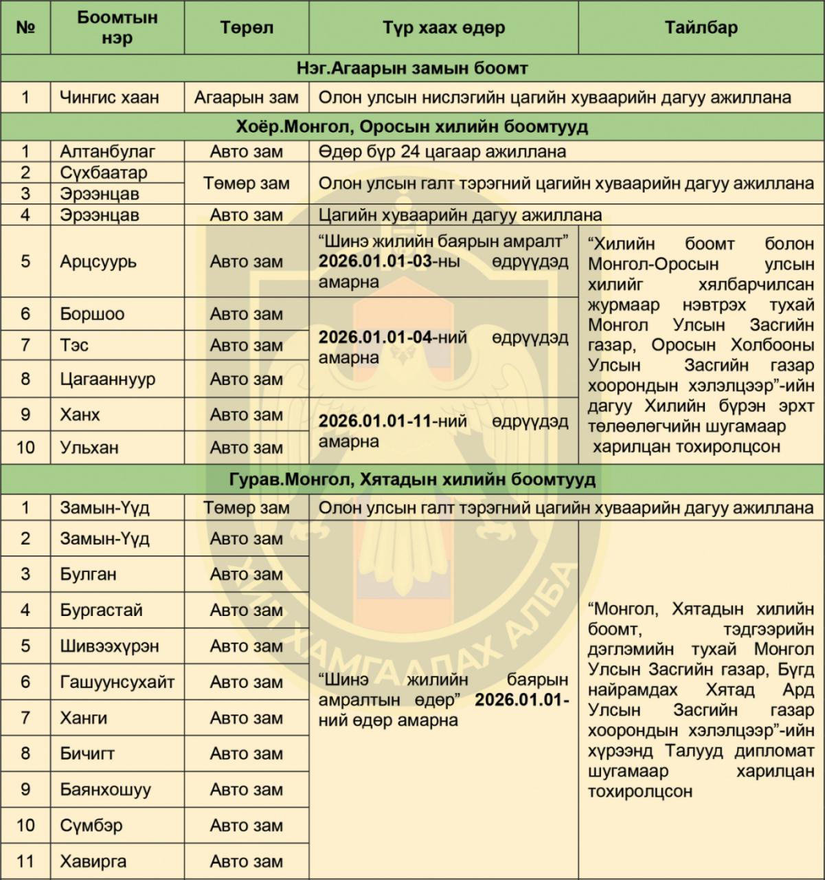 Хилийн боомтуудын 2026 оны нэгдүгээр сард ажиллах цагийн хуваарийг танилцуулж байна.