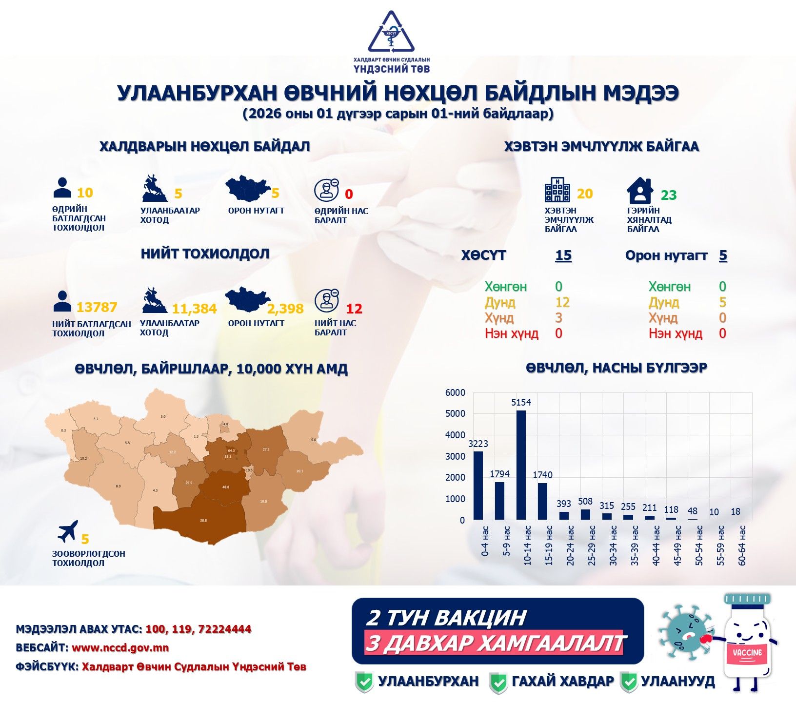 2026 оны нэгдүгээр сарын 1-ний өдрийн байдлаар Улаанбурхан өвчнөөр 20 иргэн хэвтэн эмчлүүлж байна. Мөн гэрийн хяналтад 23 өвчтөн байна. Үүнээс 15 иргэн ХӨСҮТ-д, 5 иргэн орон нутагт тус тус эмчлүүлж байгаа юм. Улаанбурхан өвчний улмаас нас барсан тохиолдол нэгээр нэмэгдэж, нийт 12 тохиолдол бүртгэгдээд байна.