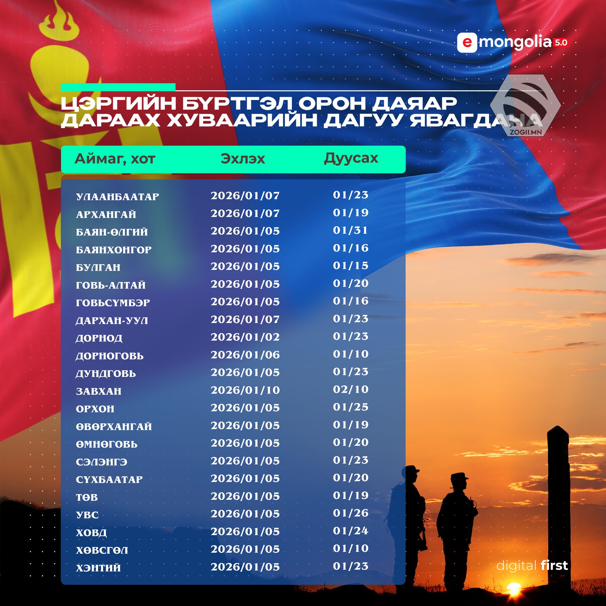 Цэргийн бүртгэл орон даяар дараах хуваарийн дагуу явагдана.