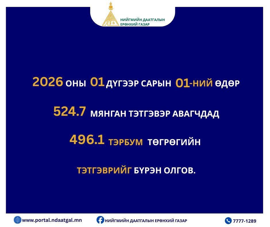 Энэ хүрээнд 2026 оны 01 дүгээр сарын 01-ний өдөр 524.7 мянган тэтгэвэр авагчдад 496.1 тэрбум төгрөгийн тэтгэврийг нэмэгдлийн хамт цаг хугацаанд нь бүрэн олголоо.
