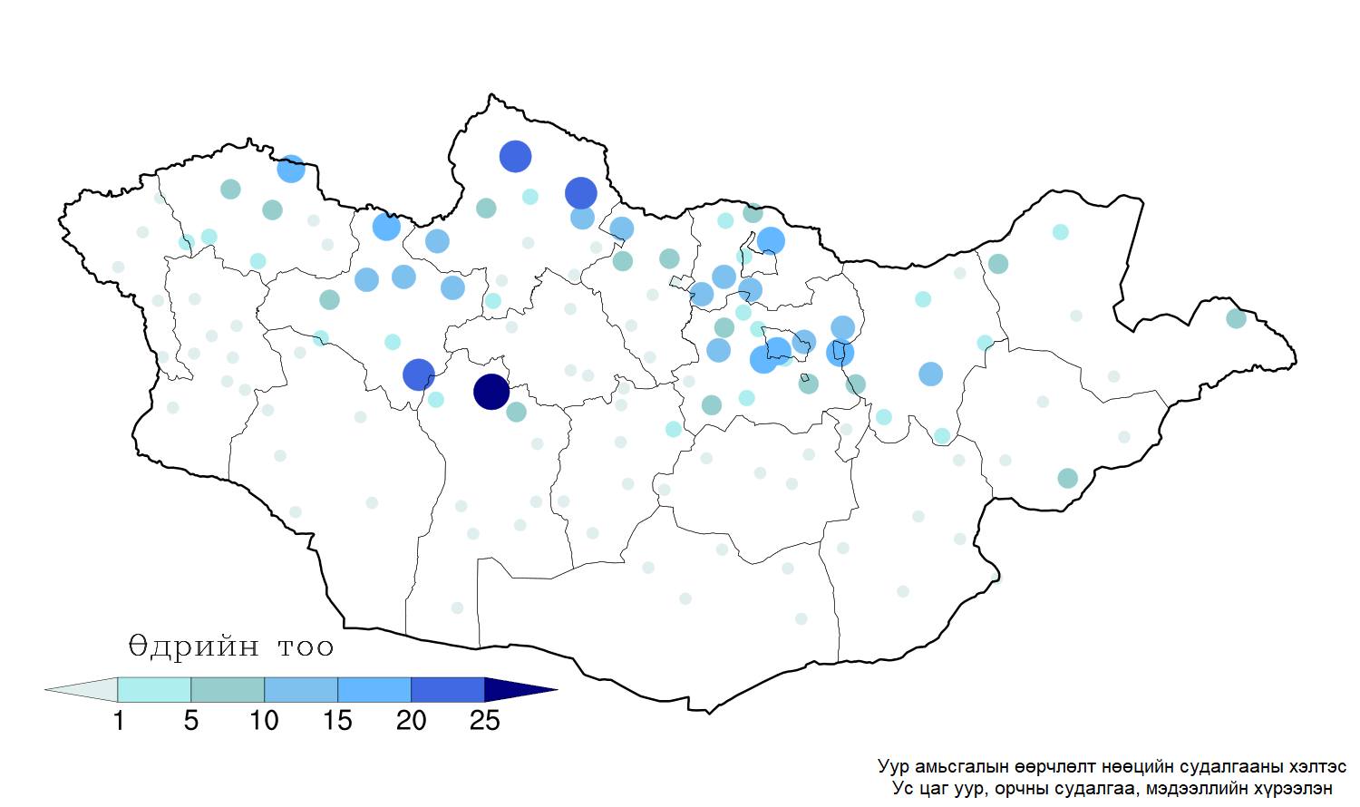 Өнгөрсөн 12 дугаар сард -30°С-аас хүйтэн өдрийн тоо Завханы Отгон, Баянхонгорын Байдраг, Хөвсгөлийн Ренчинлхүмбэ, Цагаан-Үүр орчмоор 20 өдрөөс их, Увсын Тэс, Завханы Баянтэс, Сэлэнгийн Ерөө, Төв аймгийн Алтанбулаг, Улаанбаатарын Багануур, Буянт-Ухаа орчмоор 15-19 хоног, бусад нутгаар 1-10 хоног ажиглагджээ.