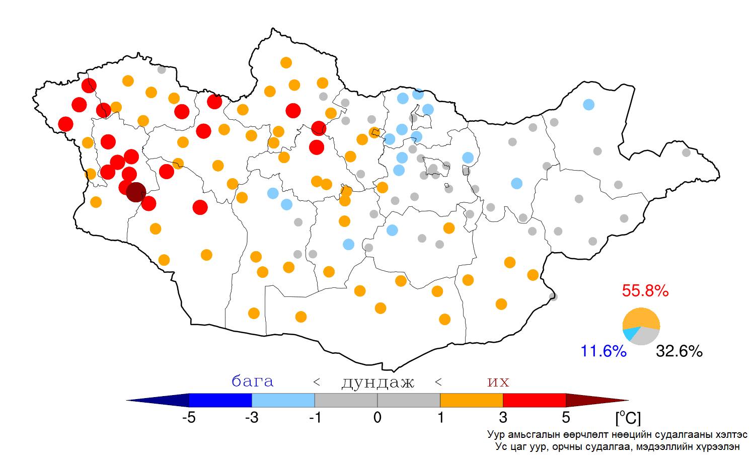 Өнгөрсөн 2025 оны 12 дугаар сарын агаарын дундаж температур өмнөх жилээс -0.3°С-аар хүйтэн, олон жилийн дунджаас 1.1°С-аар дулаан байсан ба 1940 оноос хойш тохиолдож байгаа 31 дэх дулаан сар болж өнгөрлөө. Сарын агаарын дундаж температурын олон жилийн дунджаас хазайх хазайлтын орон зайн тархалтыг авч үзэхэд нийт нутгийн 11.6% нь дунджаас -1.1°С -аас -3.0°С-аар хүйтэн, 32.6% нь дунджийн орчим, 55.8% нь дунджаас 1.1°С –аас 5.4°С-аар дулаан байжээ.