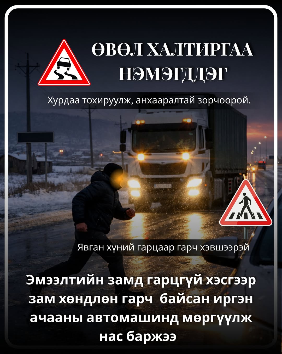Мөн жолооч тээврийн хэрэгслийн техникийн бүрэн бүтэн байдлыг хангаж, Замын хөдөлгөөний дүрмийг чанд мөрдөн, халтиргаа гулгаа ихтэй үед тохирсон хурдыг тогтоосон хэмжээнээс хэтрүүлэхгүй байхыг анхааруулъя.