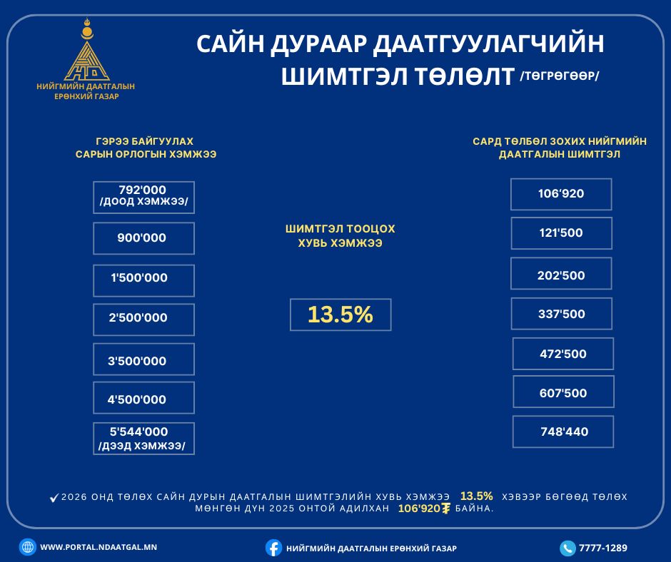 Даатгуулагч өөрийн мэдүүлсэн хөдөлмөрийн хөлс, орлогоосоо 13.5 хувиар тооцон нийгмийн даатгалын шимтгэлээ төлнө. Тухайн сард төлөх нийгмийн даатгалын шимтгэлийн төлөх мөнгөн дүн хөдөлмөрийн хөлсний доод хэмжээтэй уялддаг тул даатгуулагч 792’ 000 төгрөгөөс 13.5 хувиар тооцон төлөх юм.
