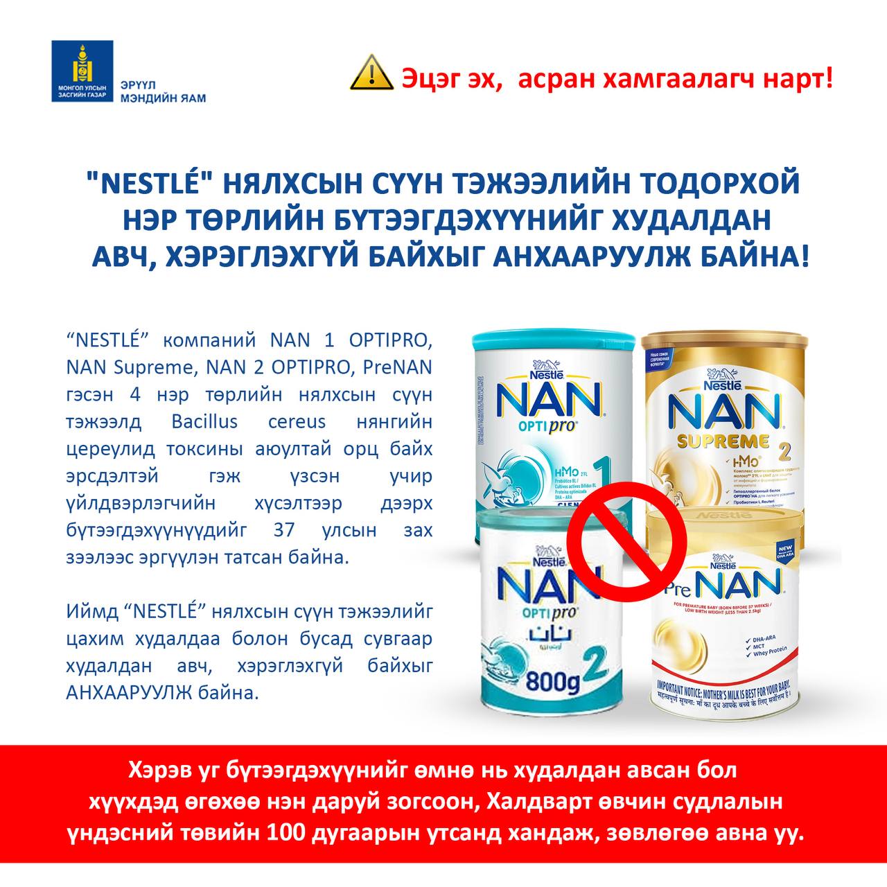"NESTLE” группийн нялхсын сүүн тэжээлийн тодорхой нэр төрлийн бүтээгдэхүүнийг худалдан авч, хэрэглэхгүй байхыг анхааруулж байна.