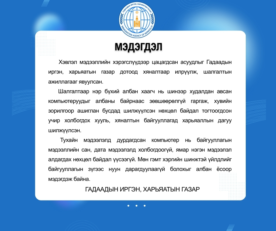 Гадаадын иргэн харьяатын газраас иргэдийн мэдээлэл хадгалагдаж байсан 8 нөүтбүүк алдагдсан гэх мэдээлэл өнөөдөр гарсан. Тухайн асуудлаар Гадаадын иргэн харьяатын газраас мэдэгдэл гаргажээ. Мэдэгдэлд: