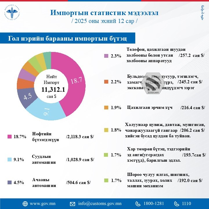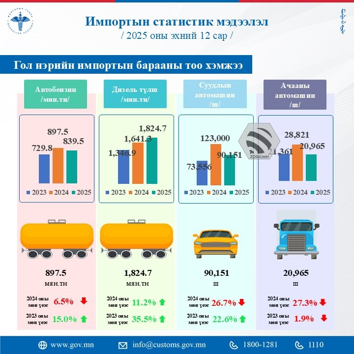2025 оны эхний 12 сарын байдлаар автобензины импортын хэмжээ 897.5 мянган тонн болж, өмнөх оны мөн үеэс 6.5 хувиар буурсан байна. Мөн суудлын автомашины импорт 90,151 ширхэгт хүрч, 2024 оны мөн үетэй харьцуулахад 26.7 хувиар багасчээ.